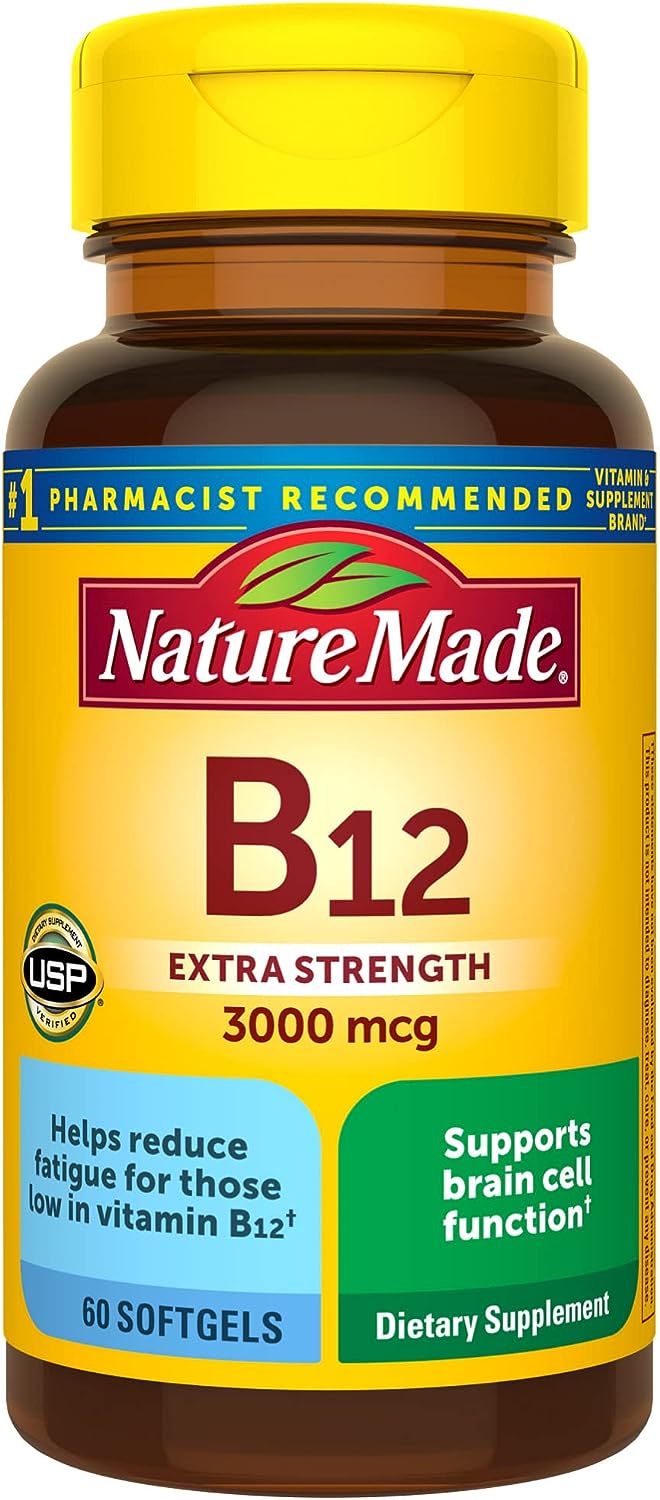 Energy metabolism support supplement: contains one 60 count bottle of Nature Made Extra Strength Vitamin B12 3000 mcg Softgels for a 60-day supply(1)These Nature Made Vitamin B12 supplements help break down food into energy that your body can use all day longB-12 vitamin supports brain cell function and production of neurotransmitters needed for mood healthVitamin B12 is important for proper red blood cell formation and for vegetarians and vegans who may not consume enough from diet aloneAdults take one B 12 vitamin softgel daily with water and a mealNature Made Extra Strength Vitamin B12 3000 mcg Softgels help break down food into energy that your body can use all day long. Sourced from high quality ingredients, this B12 supplement is a dietary supplement that has no synthetic dyes, no artificial flavors and no preservatives. These Nature Made B12 softgels help support energy metabolism(1). B12 vitamins are important for vegetarians and vegans who may not consume enough from diet alone. Adults take one of these Vitamin B12 softgels daily with a meal. Nature Made supplements are quality you can trust. USP has tested and verified ingredients, potency and manufacturing process. USP sets official standards for dietary supplements. Visit the USP verified website for more information. (1)Helps convert food into cellular energy. *Based on a survey of pharmacists who recommend branded vitamins and supplements