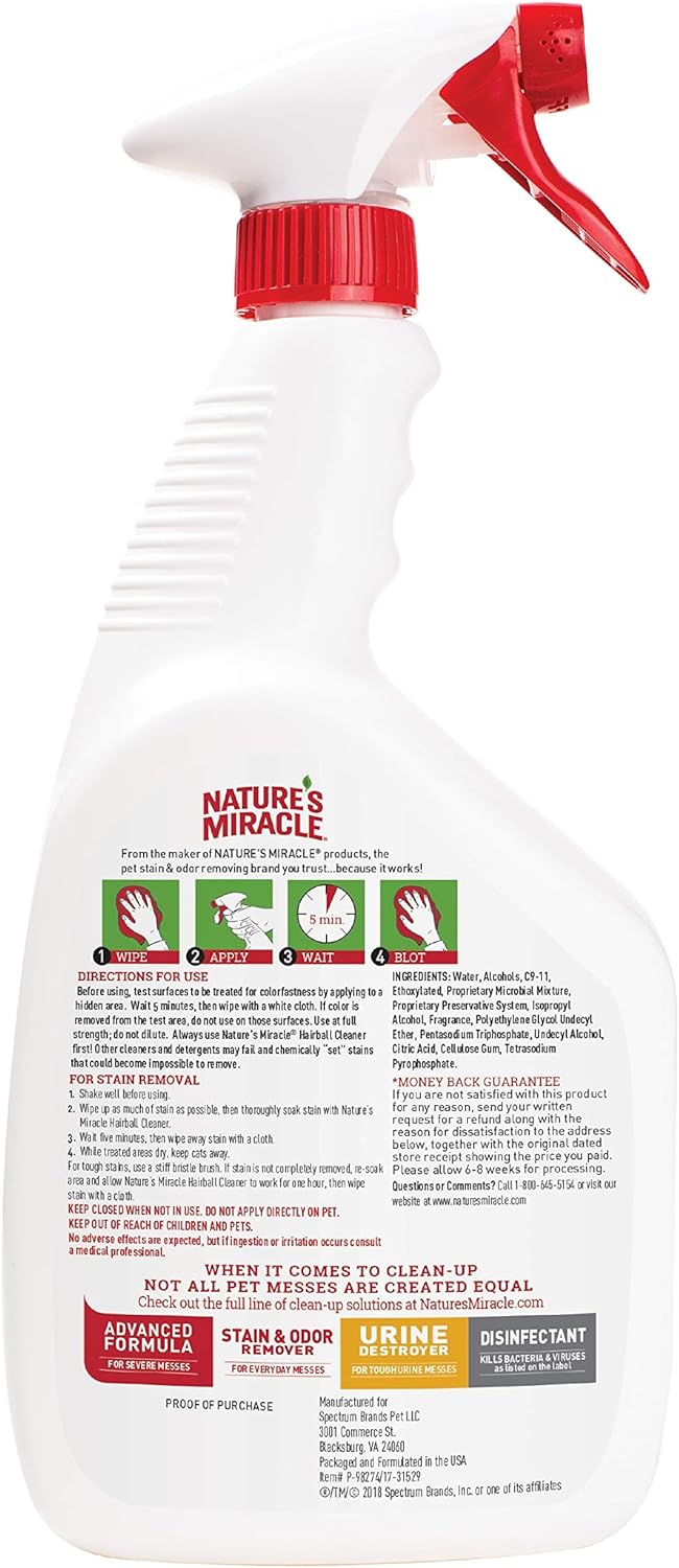 Nature’S Miracle Pet Stain And Odor Removers Have Been A Trusted Brand For Pet Mess Cleanup For More Than 35 Years. Whatever Pets Do, You Can Trust Nature’S Miracle Stain And Odor Removers, Training Aids, Disinfectants And Litter Products To Undo. As Cat Owners Know, With Cats Come Hairballs. At Nature’S Miracle Brand, We Know That Doesn’T Mean Your Home Needs To Suffer The Consequences! Nature’S Miracle Hairball Cleaner Is Designed To Lift And Separate Deep Stains Caused By Vomiting. Use The Cat Vomit And Hairball Formula On Carpets, Fabrics, Upholstery And Hard Surfaces. To Use, Simply Wipe, Apply, Wait Five Minutes And Blot! When Used And Stored As Directed, This Product Is Safe For Your Pets And Home. See Label For Complete List Of Instructions. Trust Nature’S Miracle Products For Finding Solutions For A Clean Home And A Happy, Healthy Pet