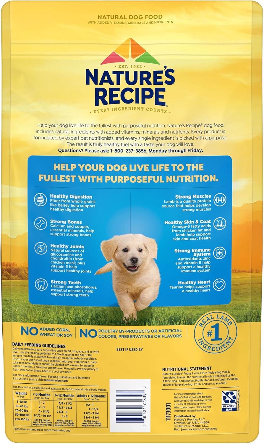 Fuel More Wag-Worthy Adventures With Wholesome Ingredients Dogs Love — At A Price YouLl Love Too. NatureS Recipe Dog Food Is Formulated By Expert Pet Nutritionists, And Every Single Ingredient Is Picked With A Purpose. The Brand Has Been Creating Purposeful Recipes For Over 40 Years. NatureS Recipe Puppy Lamb & Rice Recipe Is A Delicious, Nutritious Puppy Kibble Made To Help Support Your Growing PupS Needs. It Includes Dha To Help Support Eye And Brain Development, And More: Strong Muscles: Lamb Is A Quality Protein Source That Helps Develop Strong Muscles. Healthy Digestion: Fiber From Whole Grains Like Barley Helps Support Healthy Digestion. Healthy Skin And Coat: Omega-3 Fatty Acids From Chicken Fat And Lamb Help Support Skin And Coat Health. Strong Immune System: Antioxidants Zinc And Vitamin E Help Support A Healthy Immune System. Healthy Heart: Taurine Helps Support A Healthy Heart. Try This Tasty, Healthy Puppy Food Now To Give Your Pup Healthy Fuel For A Happy Life