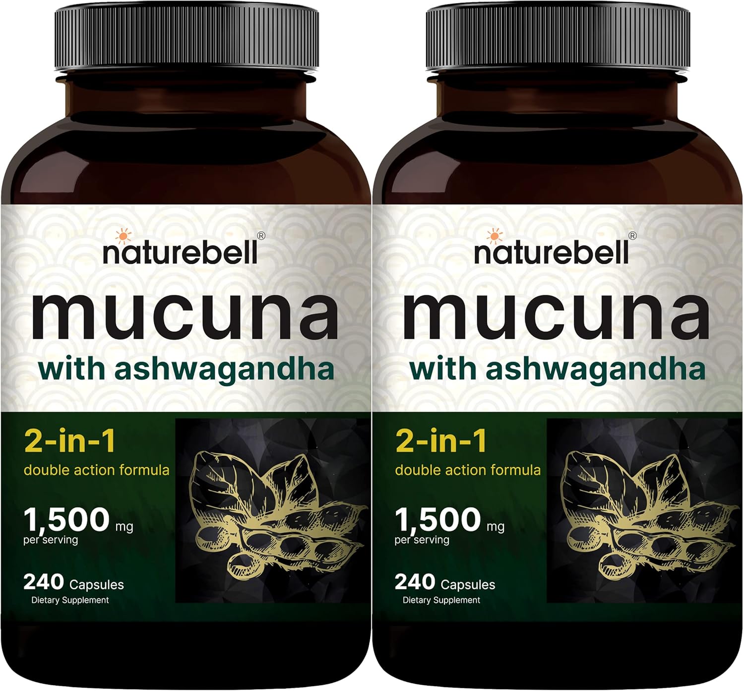 Naturebell 2 Pack Mucuna Pruriens Capsules, 1500Mg Per Serving, Made With Mucuna And Ashwagandha, 480 Capsules, 2 In 1 Formula, Contains Mucuna Pruriens Seeds For Mood Mind And Brain Health