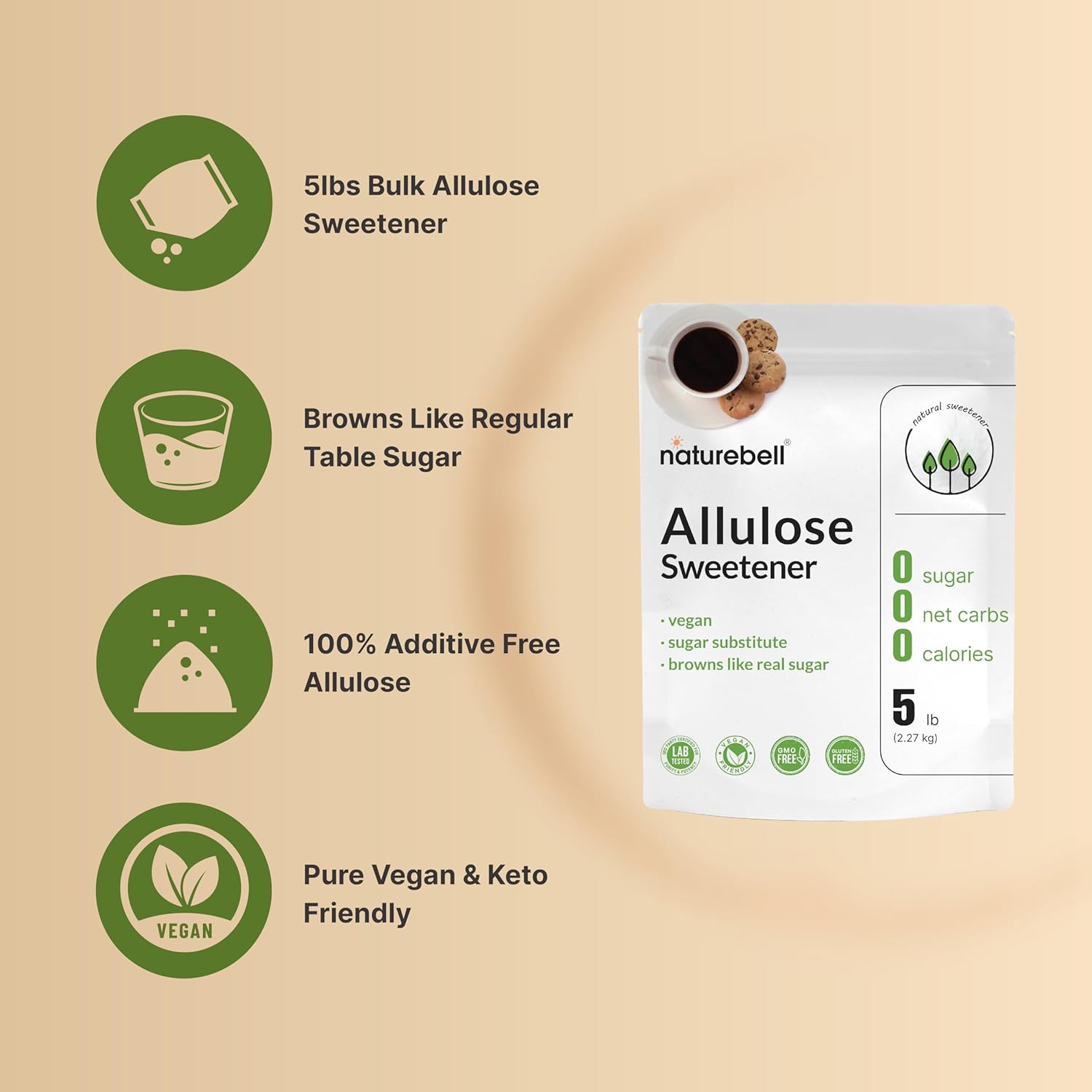 Naturebell Allulose Sweetener, 5 Lbs | Keto & Vegan-Friendly, White Sugar Substitute | 0 Calorie, 0 Sugar, 0 Net Carb, Non-Glycemic, Browns Like Table Sugar | Bulk Supply For Baking & Beverages