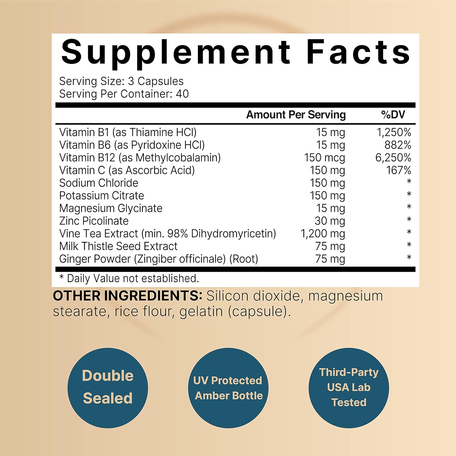 120 easy-to-swallow capsules. 3-capsule serving size. 1,875 mg dose. Up to a 40-day supply. Includes vitamins B1, B6, B12, and C, as well as sodium chloride, potassium citrate, zinc picolinate, vine tea extract (DHM), milk thistle, and ginger