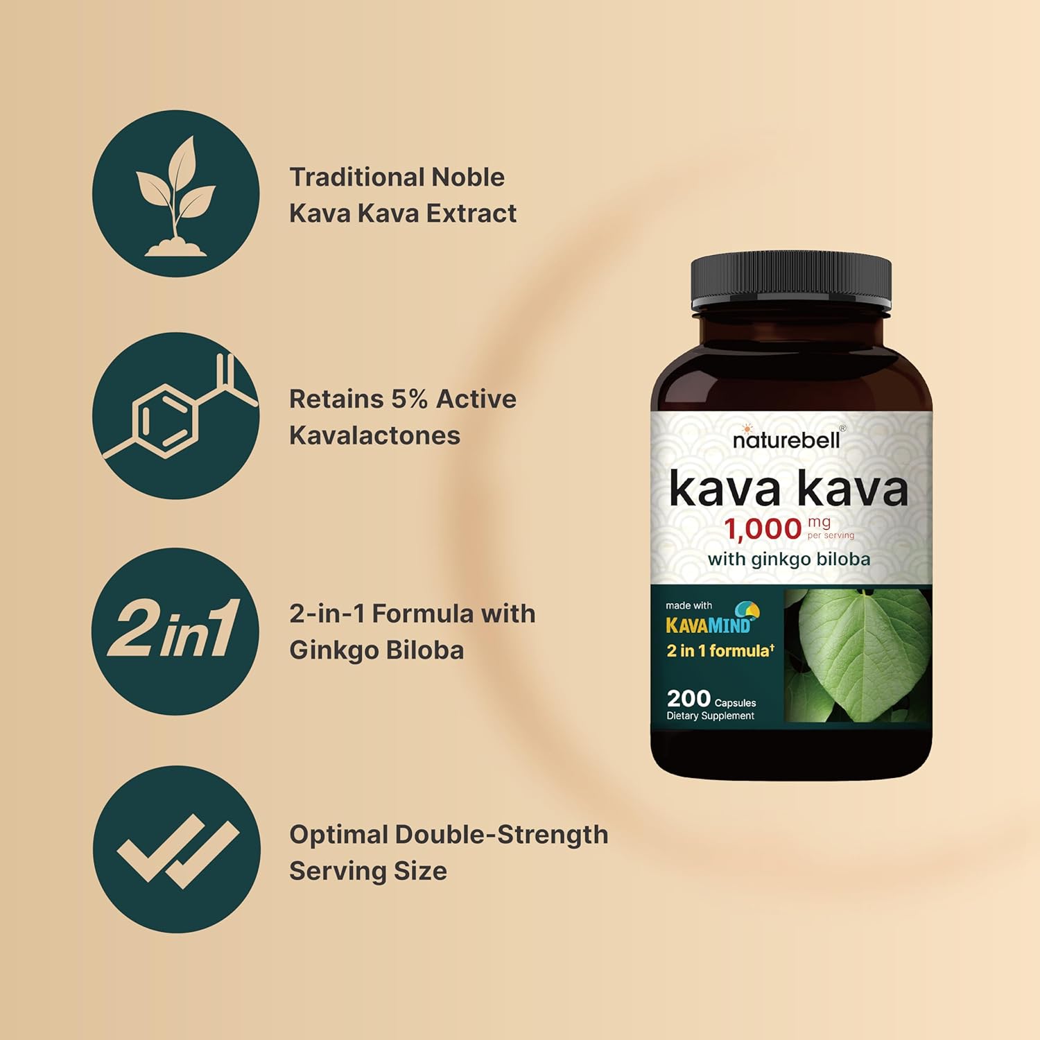 Naturebell Noble Kava Kava Supplement, Made With Kavamind, 2 In 1 Formula, High Potency Kava Kava (Piper Methysticum) 1000Mg With Ginkgo Per Serving, 200 Counts, Extracted With Active Kavalactones For Better Absorption