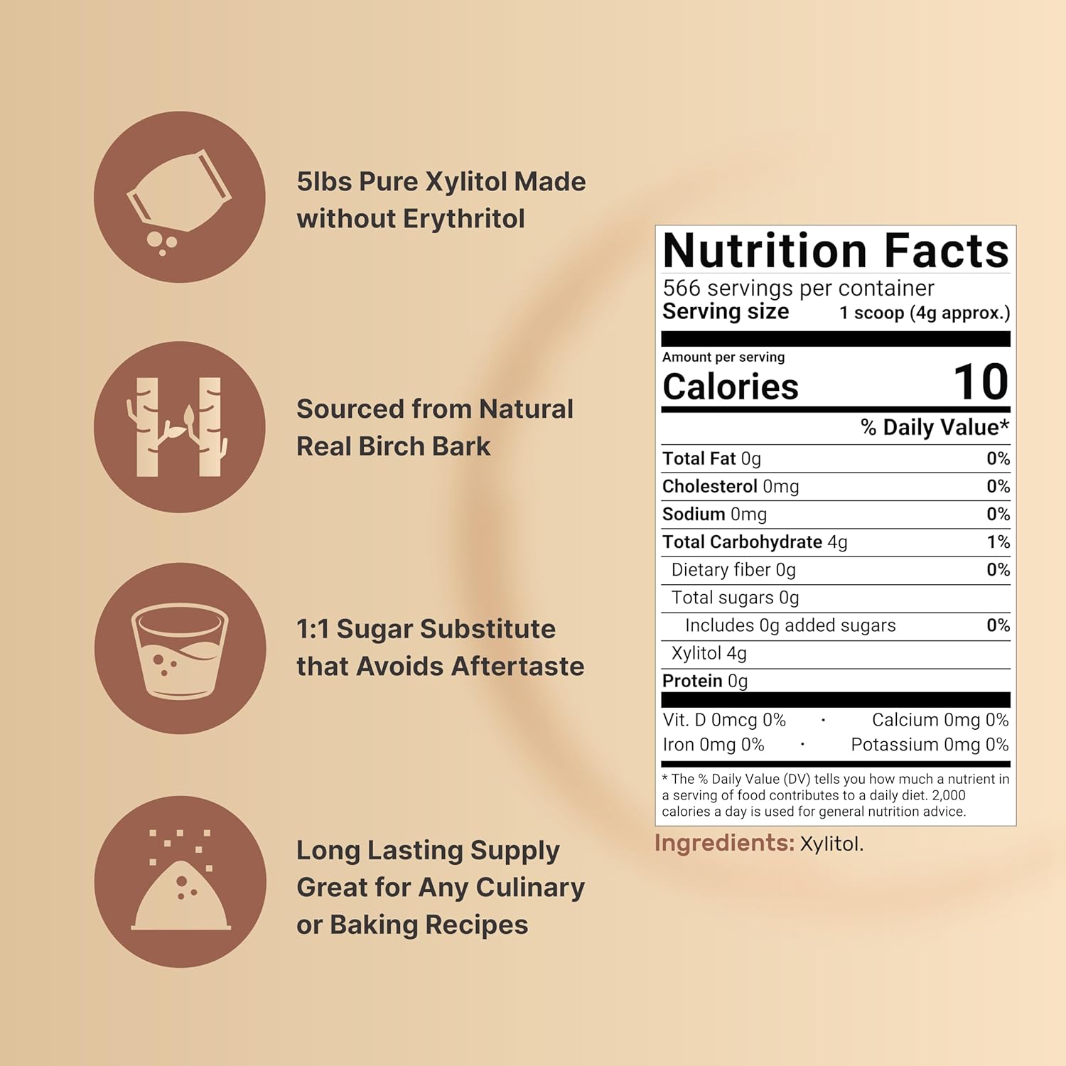 Premium 5Lb Supply Of Xylitol, 1:1 Sugar Substitute, Sourced From Natural Birch Bark Crystals, Offering A Sweet Flavor Without Erythritol And Low Glycemic Impact