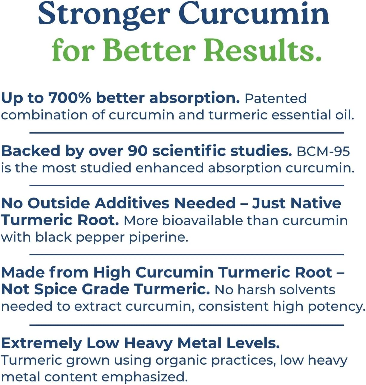 EXTREMELY LOW HEAVY METAL CONTENT - Each batch of BCM-95 is tested for heavy metals (including arsenic, cadmium, lead and mercury) and the levels are extremely low, and typically barely detectable. Unlike some other curcumin ingredients, no harsh solvents that can affect quality and purity are used
