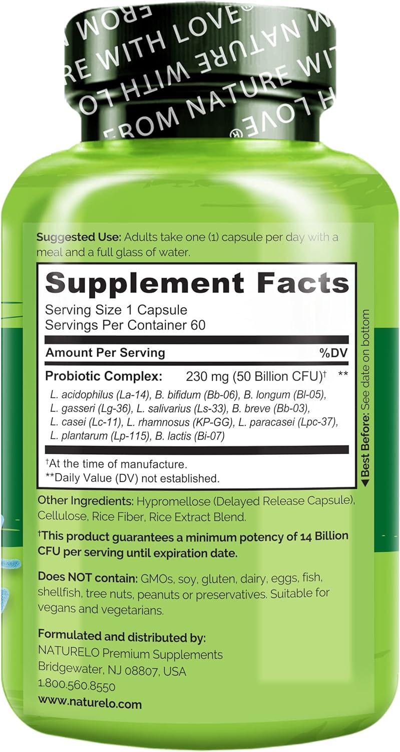 DESCRIPTION : NATURELO Probiotic Supplement - 50 Billion CFU - 11 Strains - One Daily - Helps Support Digestive & Immune Health - Delayed Release - No Refrigeration Needed - 120 Vegan Capsules