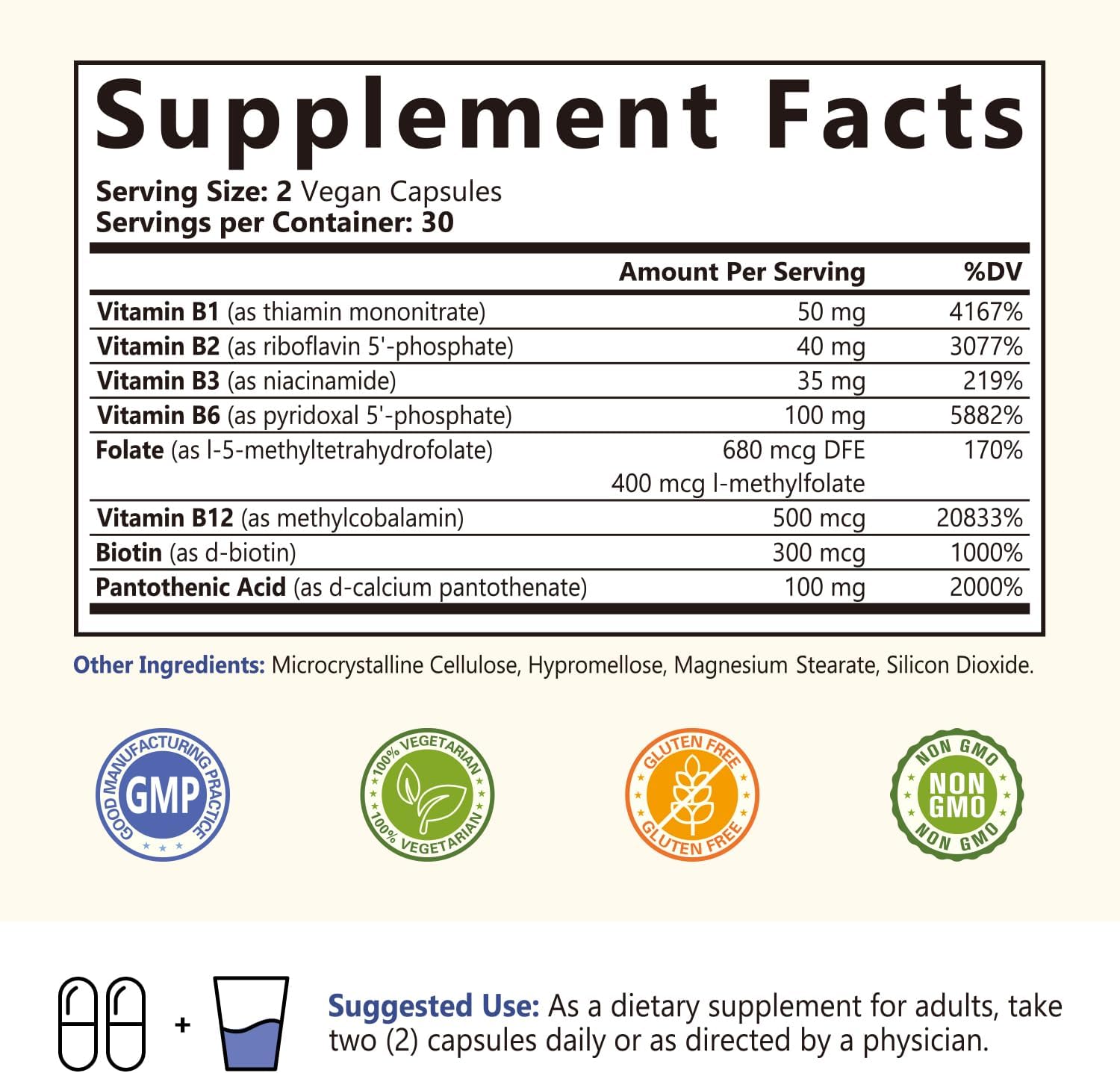NatureMyst Complete B Complex, All 8 B Vitamins, with Methyl B12, Methyl Folate, Biotin, P-5-P, Niacin, Highly Absorbable, High Potency, Well-Rounded, Energy Production, Nerve Health, 60 Vegan Caps