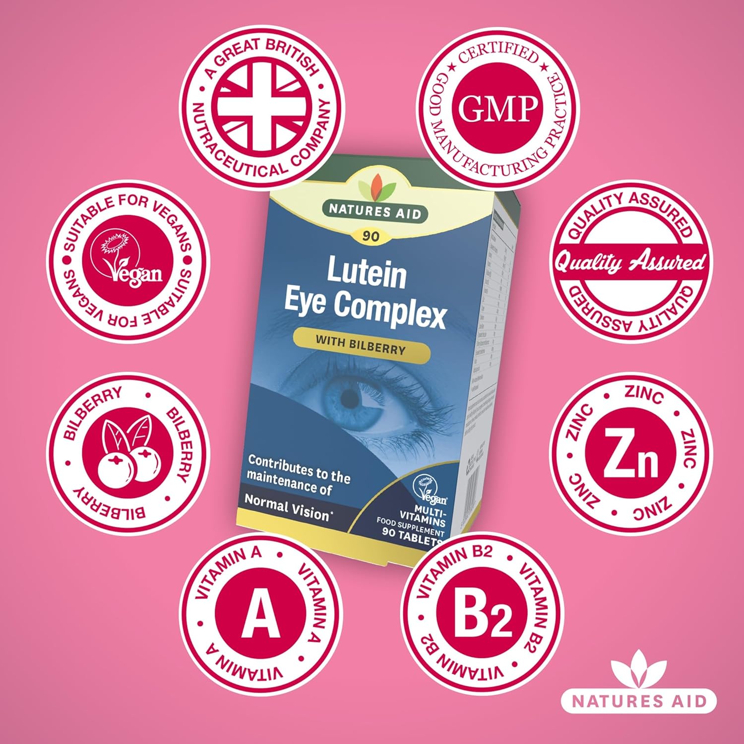 Natures Aid Lutein Eye Complex – With Bilberry, Zinc, Vitamins A B2 C E Riboflavin – Supports Normal Vision Maintenance & Eye Health – Vegan, Gluten-Free, Non-Gmo - 90 Tablets