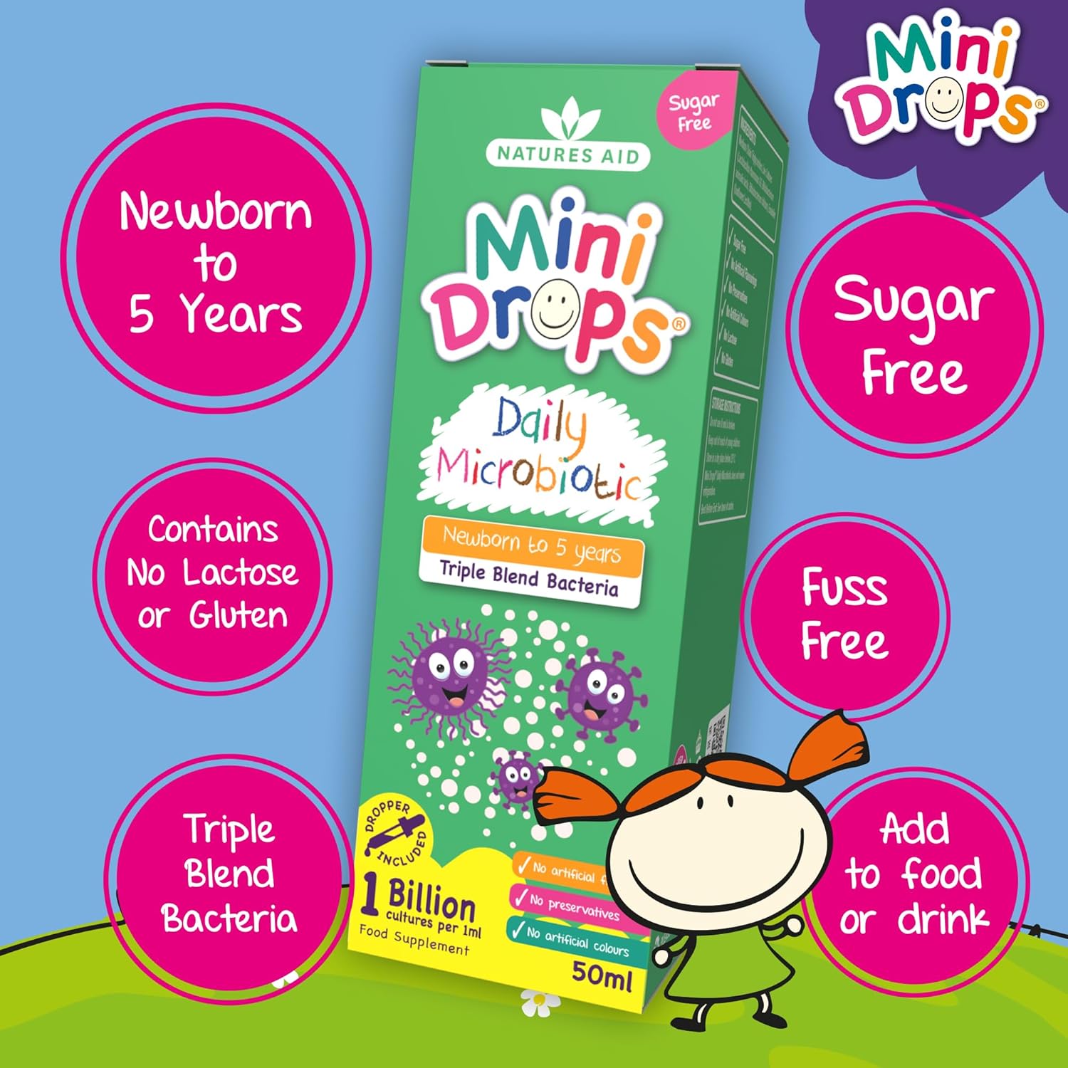 Natures Aid Mini Drops Daily Microbiotic 50Ml Liquid Drops β Gentle Gut Bacteria Support For Babies & Toddlers 0-5 Years, 1 Billion Cfu Live Cultures Per Serving - Sugar-Free, Gluten-Free, Dairy-Free
