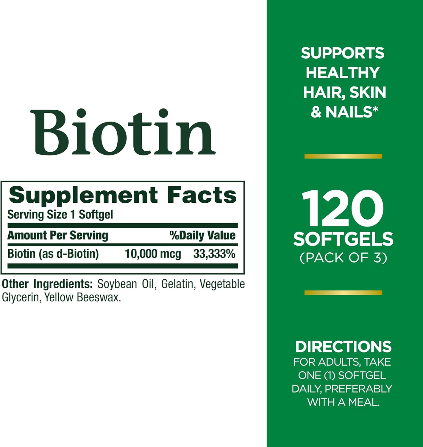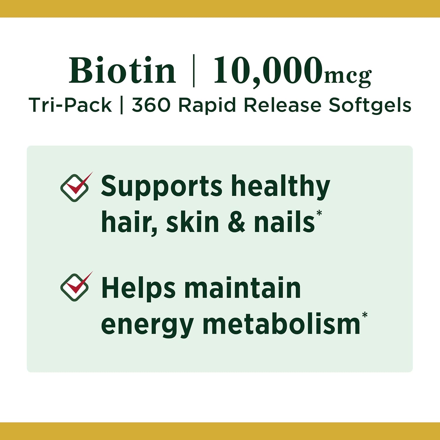 Size:120 Count (Pack Of 3) Biotin 10000Mcg Rapid Release Softgels By NatureāS Bounty Are One Of The Leading Biotin Vitamins For Healthy Hair, Skin And Nails.(1) Biotin Is A Member Of The Vitamin B Family And Is Widely Used To Support Beautiful Hair, Radiant Skin And Healthy Nails.(1) And NatureāS Bounty Biotin Hair Vitamins Do So Much More. They Also Work To Help The Body Convert Food Into Fuel To Help Maintain Energy Metabolism. (1) And That Means Taking NatureāS Bounty Biotin Every Day Can Help Men And Women Look And Feel Their Best. NatureāS Bounty Biotin Rapid Release Softgels Are Free Of Sugar, Gluten, Lactose, Sodium, And Yeast And They Contain No Artificial Flavors Or Sweeteners. And Because They Are From The Trusted Vitamin And Supplement Experts At NatureāS Bounty, You Can Be Confident These High-Quality Biotin Vitamins Are Backed By Nearly 50 Years Of Science And Innovation And Made With Only The Purest Ingredients. (1)These Statements Have Not Been Evaluated By The Food And Drug Administration. This Product Is Not Intended To Diagnose, Treat, Cure Or Prevent Any Disease
