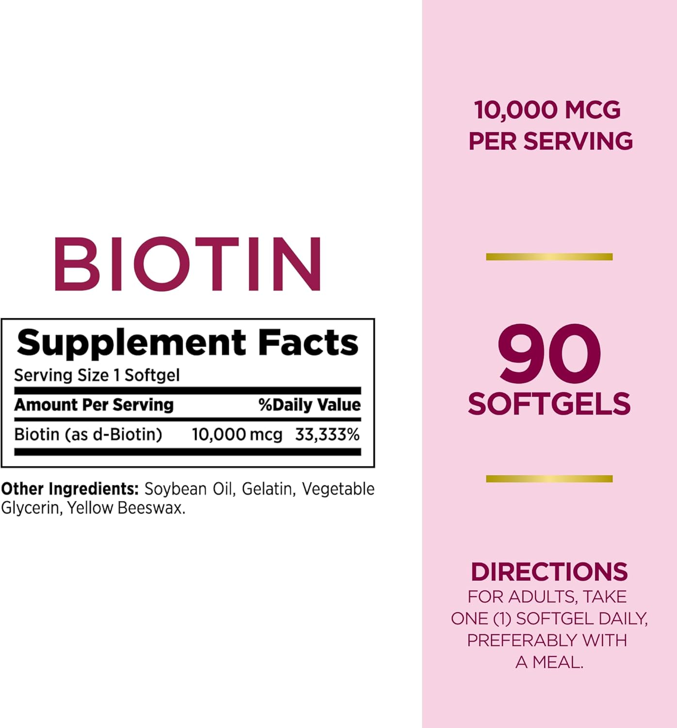 Nature’S Bounty Biotin Softgels Are Expertly Crafted To Nurture Your Hair, Skin, And Nails, Helping You Radiate Confidence. (1) Biotin, Also Known As Vitamin B7, Works By Supporting The Production Of Keratin, A Protein Crucial For Maintaining The Structural Integrity Of Your Hair, Skin, And Nails. Support Your Beauty And Wellness Journey By Supplementing With Our Softgels For Beautiful Hair, Vibrant Skin And Healthy Nails. (1) Incorporating Nature’S Bounty Biotin Softgels Into Your Daily Routine Is A Simple Yet Impactful Way To Invest In Your Overall Well-Being And Unlock Your Natural Radiance From Within