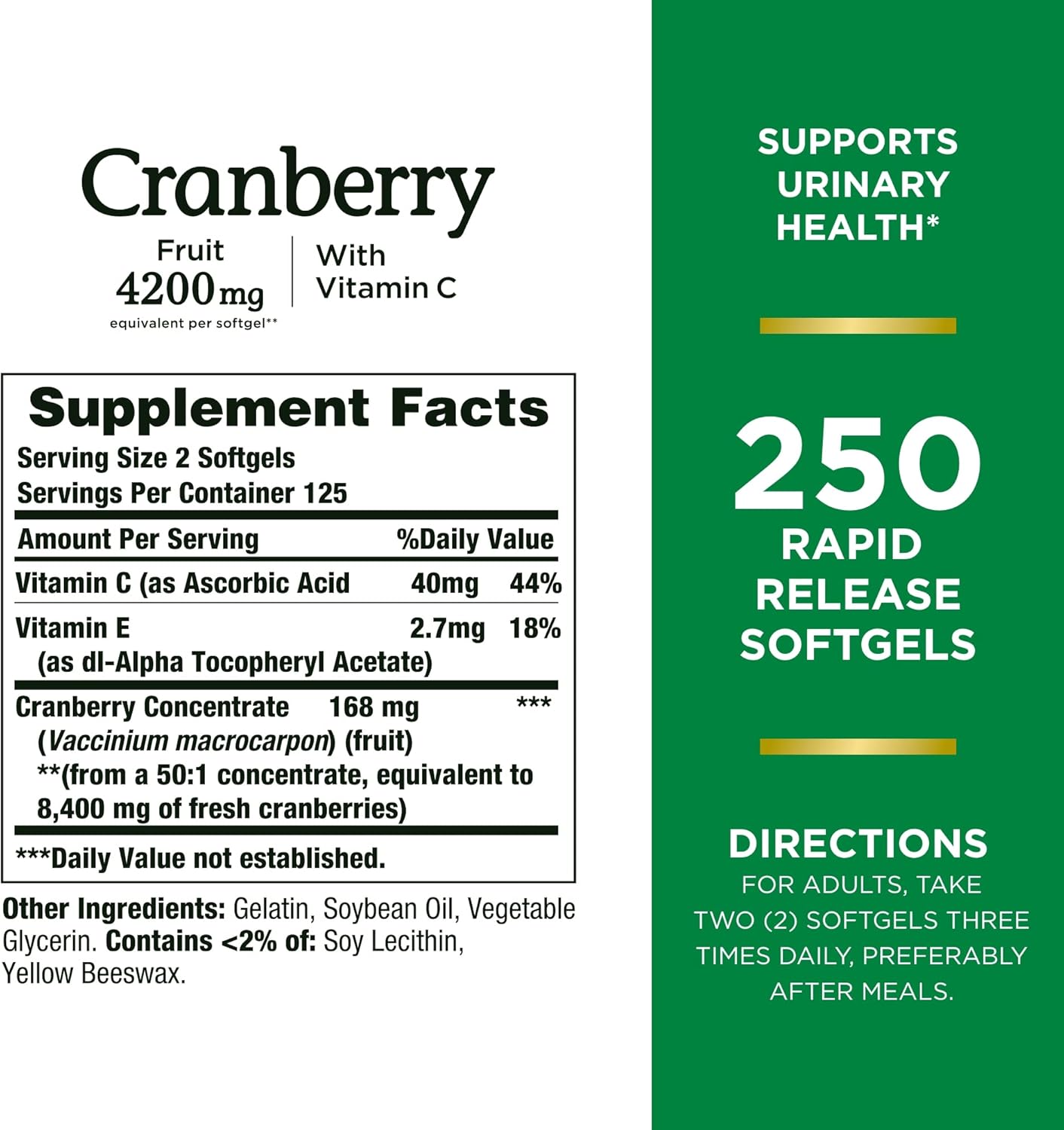 Nature'S Bounty Cranberry 4200Mg With Vitamin C, Urinary Health & Immune Support, Cranberry Concentrate, 250 Rapid Release Softgels