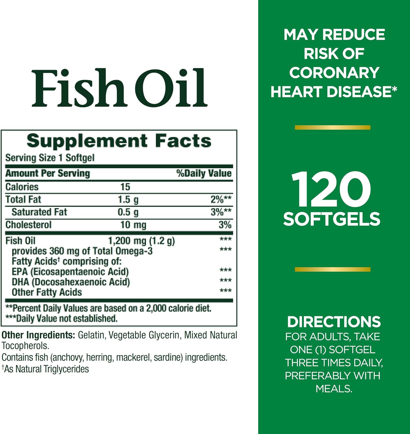 These Statements Have Not Been Evaluated By The Food And Drug Administration. This Product Is Not Intended To Diagnose, Treat, Cure Or Prevent Any Disease. **Supportive But Not Conclusive Research Shows That Consumption Of Epa And Dha Omega-3 Fatty Acids May Reduce The Risk Of Coronary Heart Disease. One Serving Of Fish Oil Provides 600 Mg Total Of Epa, Dha And Other Omega-3 Fatty Acids. See Nutrition Information For Total Fat, Saturated Fat And Cholesterol Content