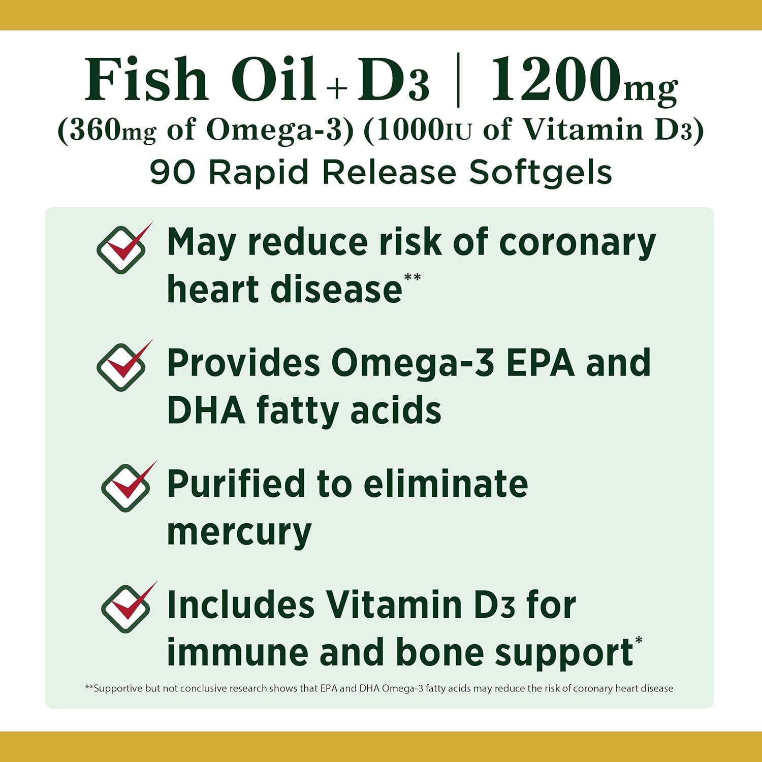 Nature'S Bounty Fish Oil Plus D3, Contains Omega 3, Immune Support & Supports Heart Health, 1200Mg Fish Oil, 360Mg Omega 3, 1000Iu Vitamin D3, 90 Softgels
