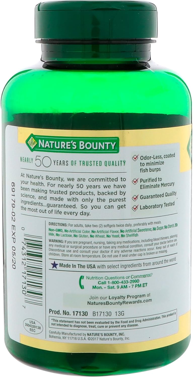 For Your Heart 90-Count; 2400Mg; 1200Mg Of Omega-3; Fish Oil Softgels10Omega-3 Epa & Dha Nature’S Bounty Fish Oil Softgels Contain The Two Most Studied Omega-3 Fatty Acids; Fatty Acids Are Essential Nutrients That Help Support The Health Of Your Cardiovascular System (1)10Mercury-Free Because They’Re From The Trusted Vitamin Experts At Nature’S Bounty These High-Quality Fish Oil Softgels Are Purified To Eliminate Mercury10Purity Is Our Priority Nature’S Bounty Is Committed To Safety And Purity In All Our Supplements; Our Omega-3 Fish Oil Softgels Contain No Shellfish And Are Non-Gmo; Gluten And Sugar Free And Contain No Artificial Colors Or Sweeteners10From The Trusted Wellness Experts Nature’S Bounty Fish Oil Softgels Are A Product Of 50 Years Of Dedication To Quality Consistency And Scientific Research To Make Vitamins And Nutritional Supplements Of Unrivaled Excellence10Fish Oil Coated Softgels By Nature’S Bounty Provide Many Important Health Benefits For Your Body. Nature’S Bounty Omega-3 Fish Oil Coated Softgels Contain Both Dha And Epa, Two Omega-3 Fatty Acids That Are Found Naturally Occurring In Fatty Fish. Omega-3 Fatty Acids Are Essential Nutrients That Play An Important Role In The Health Of Your Heart And Cardiovascular System(1). And Because These High-Quality Omega-3 Fish Oil Softgels Are From The Trusted Vitamin And Supplement Experts At Nature’S Bounty, You Can Be Sure They Are Purified To Eliminate Mercury, Contain No Shellfish, And Are Non-Gmo, Sugar- And Gluten-Free. Nature’S Bounty Omega-3 Fish Oil Softgels Are Part Of A Line Of Heart Health Supplements Backed By Nearly 50 Years Of Science, Innovation And Expertise. One Serving Of Fish Oil Provides 1200 Mg Total Of Epa, Dha And Other Omega-3 Fatty Acids. See Nutrition Information For Total Fat And Cholesterol Content. (1)These Statements Have Not Been Evaluated By The Food And Drug Administration. This Product Is Not Intended To Diagnose, Treat, Cure Or Prevent Any Disease