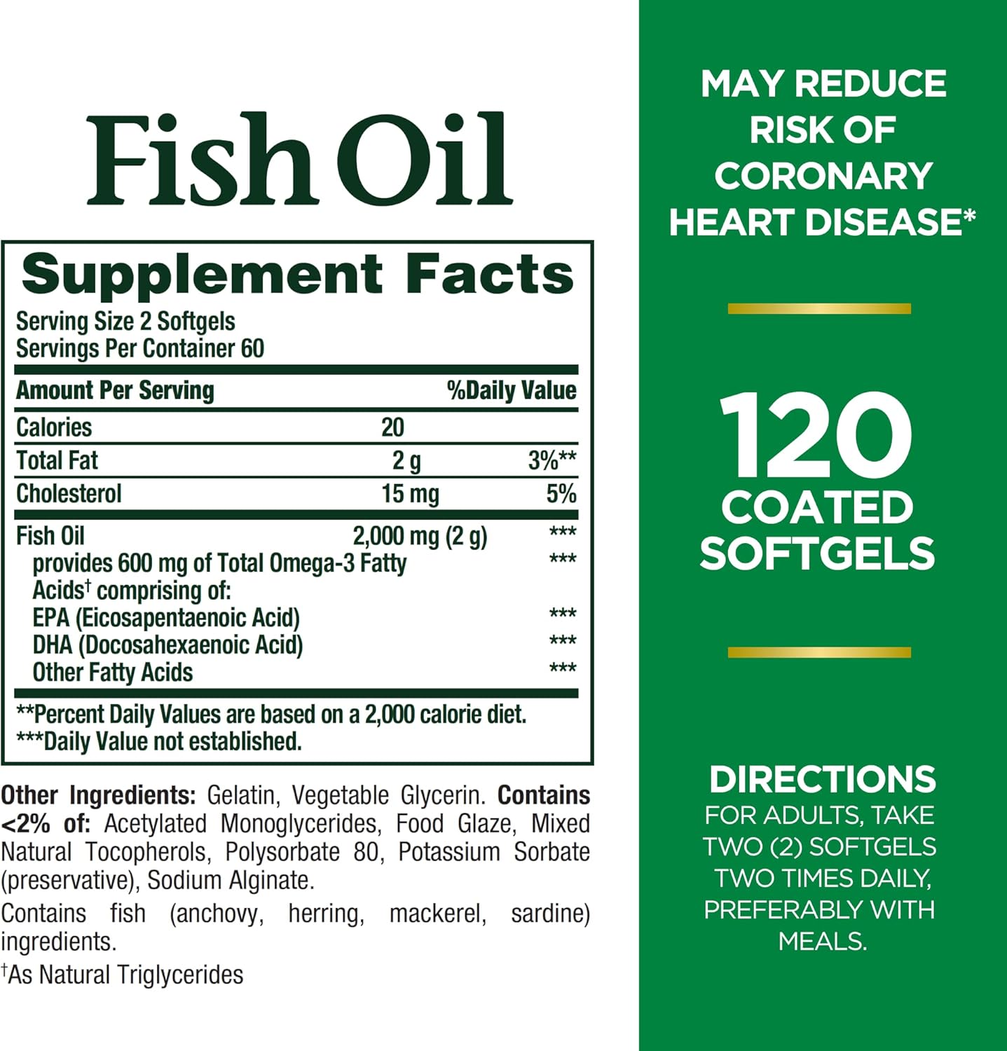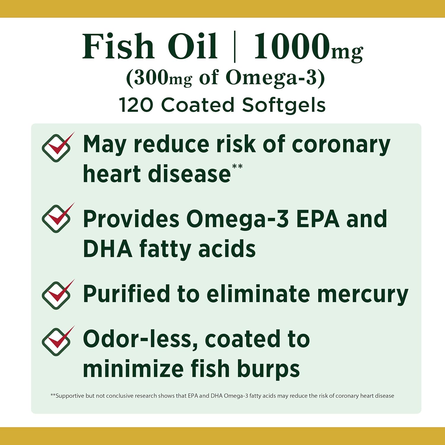 Nature'S Bounty Fish Oil 1000 Mg Contains Epa And Dha, Two Omega-3 Fatty Acids That Help Support And Maintain The Health Of Your Cardiovascular System. (1) Omega-3 Fatty Acids Are Considered āGoodā Fats Important For Cellular, Heart And Metabolic Health And Help Maintain Triglyceride Levels Already Within A Normal Range. (1) These High-Quality NatureāS Bounty Fish Oil Softgels Are Purified To Eliminate Mercury. NatureāS Bounty Is Committed To Safety And Quality In All Our Supplements. Our Omega-3 Fish Oil Softgels Contain No Shellfish. They Are Non-Gmo, Gluten- And Sugar-Free, And Contain No Artificial Colors Or Sweeteners. For Adults, Take Two Softgels Two Times Daily, Preferably With Meals. Each Bottle Of Nature'S Bounty Fish Oil Contains 120 Coated Softgels. (1)These Statements Have Not Been Evaluated By The Food And Drug Administration. This Product Is Not Intended To Diagnose, Treat, Cure Or Prevent Any Disease. Please Refer To Product Label For Most Up To Date Information
