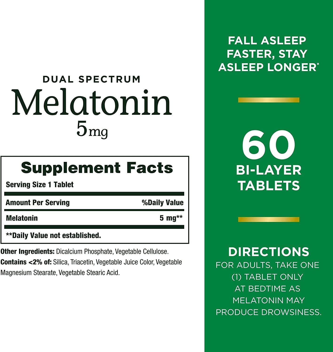 Pack Of 2. NatureāS Bounty Dual Spectrum Melatonin Tablets Contain Two Layers: Quick Release And Extended Release, Helping You Fall Asleep Faster And Stay Asleep Longer. (1) If Stress And A Busy Schedule Are Making It Hard To Get A Good NightāS Rest, Melatonin May Be The Sleep Supplement You Need For Occasional Sleeplessness. (1) Bi-Layer Technology Ensures The Quick Release Portion Of Each Tablet Delivers Ingredients Fast And Effectively, While The Extended Release Portion Works Over The Course Of Several Hours To Promote Sound Sleep. (1) Designed To Support Specific Dietary Needs, NatureāS Bounty Dual Spectrum Melatonin Tablets Are Gluten Free, Dairy Free, And Wheat Free, And Contain No Artificial Flavors Or Sweeteners