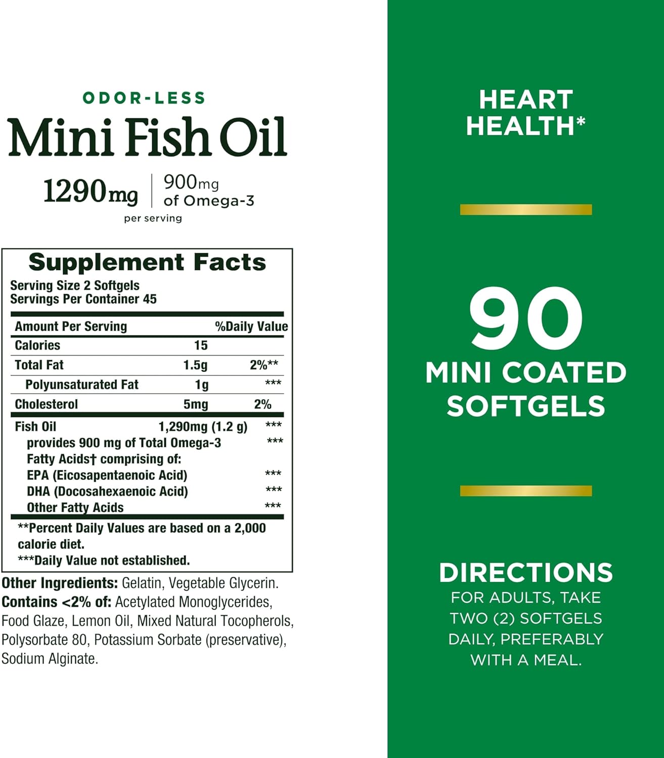 Small & Easy To Swallow: 35% Smaller Than Our Regular Softgels; Nature’S Bounty Mini Fish Oil Softgels Offer An Easier Way To Support Heart Health (1); Our Mini Softgels Are Formulated To Be Odor-Less And Are Coated To Prevent Unpleasant “Fish Burps"
