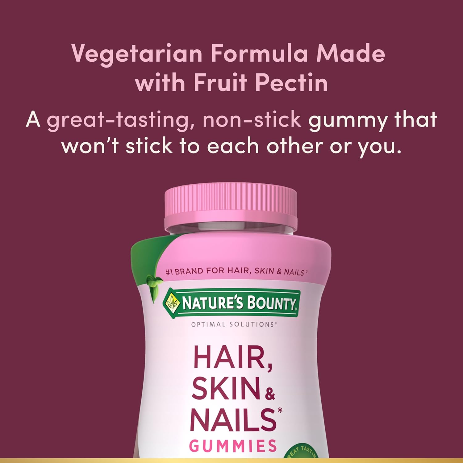 ItāS In Your Nature To Glow; Nature'S Bounty Hair, Skin & Nails Pectin Gummies Provide You With The Vital Nutrients Your Body Needs To Support Your Natural Beauty From Within.(1) Each Serving Of Our Delicious Strawberry-Flavored Vegetarian Gummies Contains 2,500 Mcg Of Biotin To Help Support Beautiful Hair, Glowing Skin, Healthy Nails And Overall Beauty.(1) Nature'S Bounty Hair, Skin & Nails Gummies Contain Antioxidant Vitamin C, Acting As The Basis For Glowing Skin, And Antioxidant Vitamin E, A Nutrient Found On The Most Outermost Skin Surface, Contributing To Skin Health.(1) Our Hair, Skin & Nails Pectin Gummies Are Made With Fruit Pectin And Offer A Non-Stick Gummy Experience From The #1 Brand For Hair, Skin & Nails! (2) NatureāS Bounty Hair Skin & Nails Gummies Are Non-Gmo, Gluten-Free, And Contain No Artificial Flavors Or Sweeteners. With 50 Years Of Making Quality Vitamins And More Than 20 Years In The Beauty Business, You Can Trust That Every NatureāS Bounty Product Is Backed By Science And Made With The High Quality Ingredients. Adults: Chew Two Gummies Daily, Preferably With A Meal