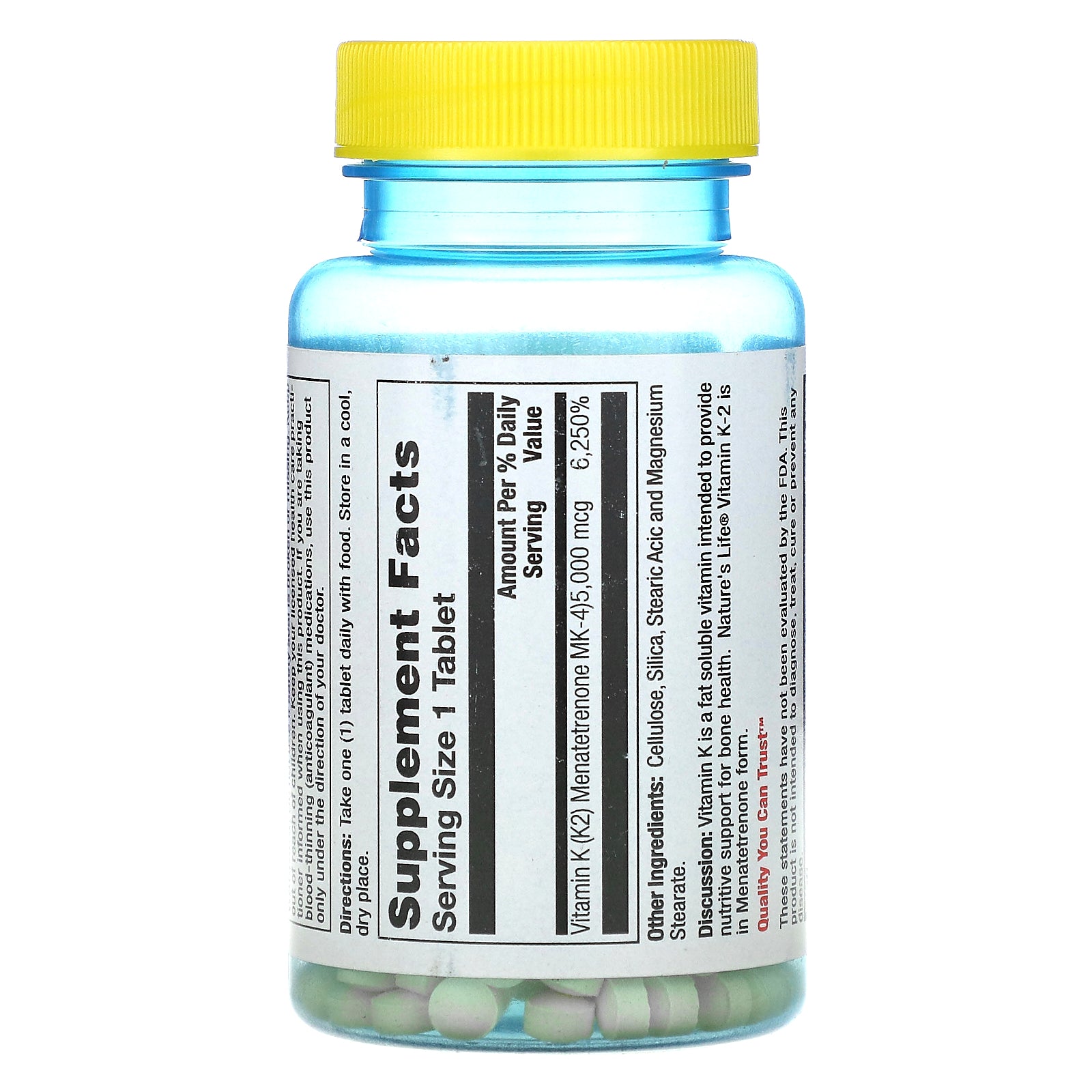 Vitamin K is a fat soluble vitamin intended to provide nutritive support for bone health. Nature's Life® Vitamin K-2 is in Menatetrenone form.