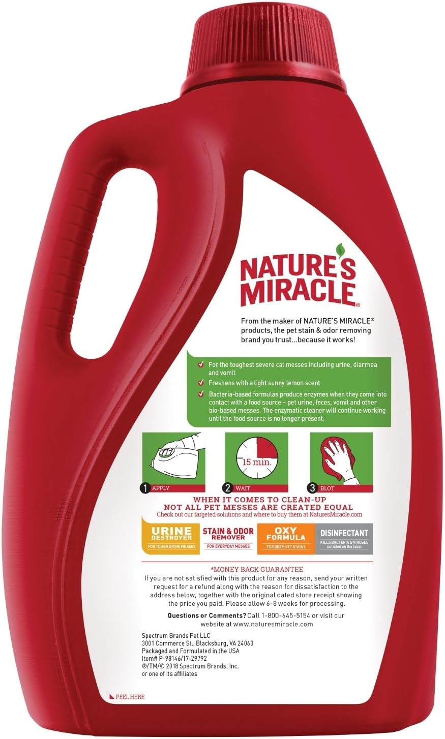 Nature’S Miracle Pet Stain And Odor Removers Have Been A Trusted Brand For Pet Mess Cleanup For More Than 35 Years. Whatever Pets Do, You Can Trust Nature’S Miracle Stain And Odor Removers, Training Aids, Disinfectants And Litter Products To Undo. Nature'S Miracle Advanced Stain And Odor Eliminator Is Formulated For Severe Cat Messes And Works To Discourage Re-Soiling By Removing The Odor Of Cat Messes. The Bacteria-Based Formulas Produce Enzymes When They Come Into Contact With A Food Source — Pet Urine, Feces, Vomit And Other Bio-Based Messes. The Enzymatic Cleaner Will Continue Working As Long As The Food Source Is Present. The Stain And Odor Eliminator Is Safe To Use On Carpets, Hard Floors, Furniture, Fabrics And More, When Used As Directed, And Leaves You With A Sunny Lemon Scent. Trust The Miracle When Finding Solutions For A Clean Home And A Happy, Healthy Pet