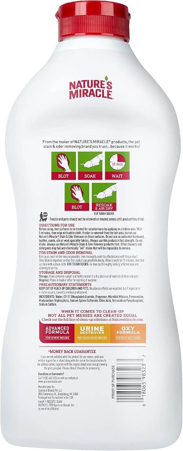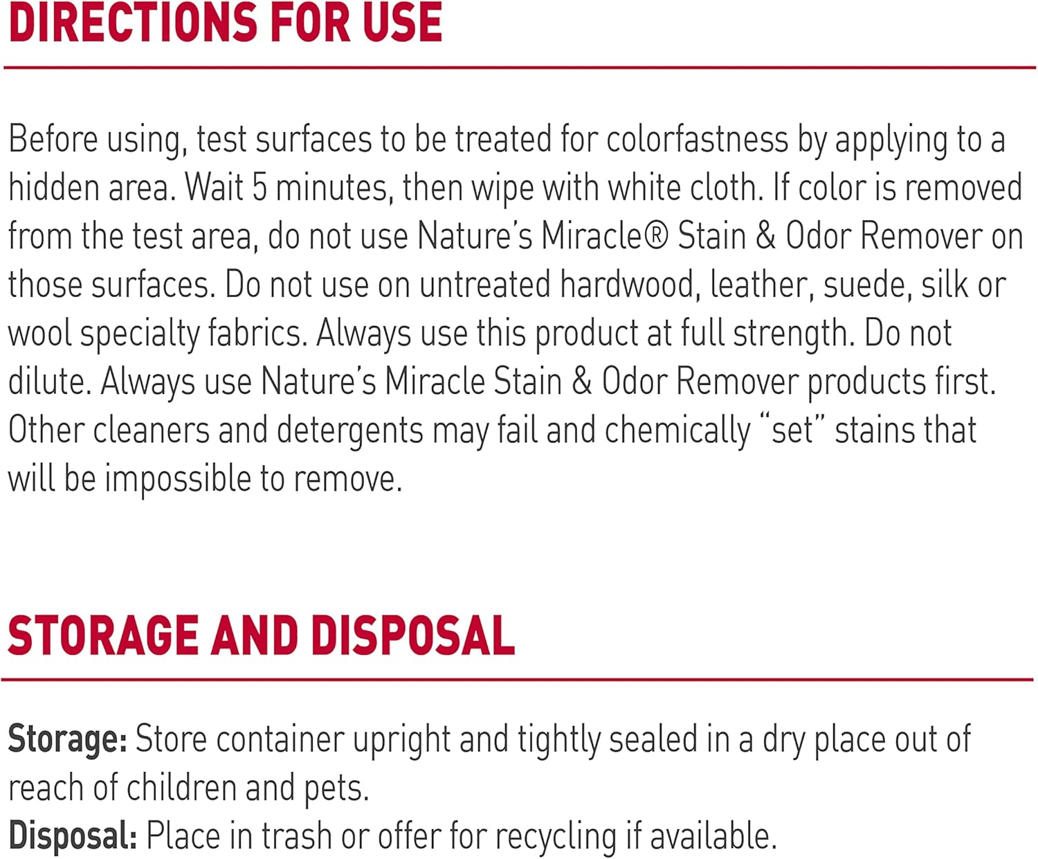 NatureāS Miracle Has Been A Trusted Brand For Pet Mess Cleanup For More Than 35 Years. Whatever Pets Do, You Can Trust NatureāS Miracle Pet Stain And Odor Removers And Disinfectants To Undo. Accidents Happen, As Every Cat Owner Knows. NatureāS Miracle Stain & Odor Remover For Cats Is An Enzymatic Spot Stain And Odor Remover ThatāS Tough On Cat Urine, Feces, Vomit, Drool And Other Organic Stains While Freshening With A Light Scent! Bottle Update With Easy Pour Makes Cleanup Easier. Bacteria-Based Formulas Produce Enzymes When They Come Into Contact With A Food Source ā Pet Urine, Feces, Vomit And Other Bio-Based Messes. This Enzymatic Cleaner Continues Working As Long As The Food Source Is Present.For Use On Carpets, Hard Floors, Furniture, Fabrics And More. *Do Not Use On Untreated Hardwood, Leather, Suede, Silk Or Wool Specialty Fabrics. Always Use This Product At Full Strength. Just Soak The Affected Area, Allow To Work For 15 Minutes, Then Blot Up Stain With A Clean Cloth. For Tough Odors, Re-Treat By Thoroughly Soaking Affected Area And Allowing To Air Dry. When Used And Stored As Directed, This Product Is Safe To Use Around Your Pets And In Your Home. Always Use NatureāS Miracle Products First. Other Cleaners And Detergents May Fail And Chemically āSetā Stains That Will Be Impossible To Remove. *When Used And Stored As Directed