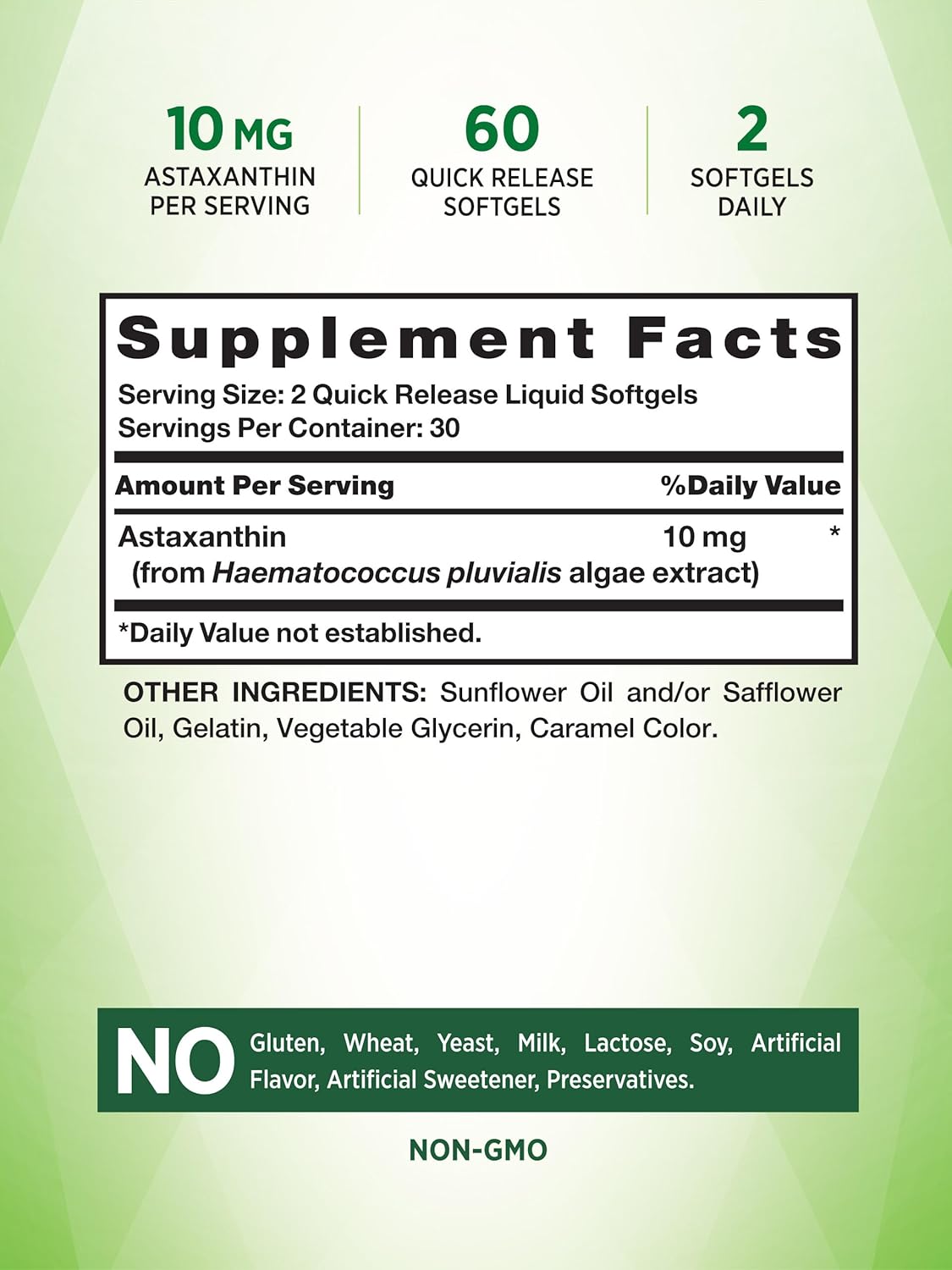 What Is Astaxanthin Astaxanthin Is An Algae-Derived Antioxidant. This Type Of Microalgae Is Responsible For The Reddish Color In Many Aquatic Organisms, Such As Salmon, Shrimp, And Lobster. While You Can Obtain Astaxanthin From Seafood Sources, The Amount Varies From Species To Species. NatureāS Truth Astaxanthin Softgels Each Serving Of Our Astaxanthin Softgels Delivers 10 Mg Of Astaxanthin Derived From The Extract Of The Algae Haematococcus Pluvialis. This Extra Strength Formula Is A Wonderful Way To Include A Naturally Occurring Antioxidant In Your Daily Routine. NatureāS Truth: Where Wellness Begins Our Mission At NatureāS Truth Is To Meet Your Wellness Needs With Products That Go Above And Beyond. NatureāS Truth Provides Supplements In Various Delivery Forms, Such As Capsules, Softgels, Chewables, Tablets, Powders, Liquids, And Gummies To Suit Every Preference. Our Astaxanthin Is Non-Gmo And Free Of Gluten, Wheat, Yeast, Milk, Lactose, Soy, Artificial Flavor, Artificial Sweetener, And Preservatives