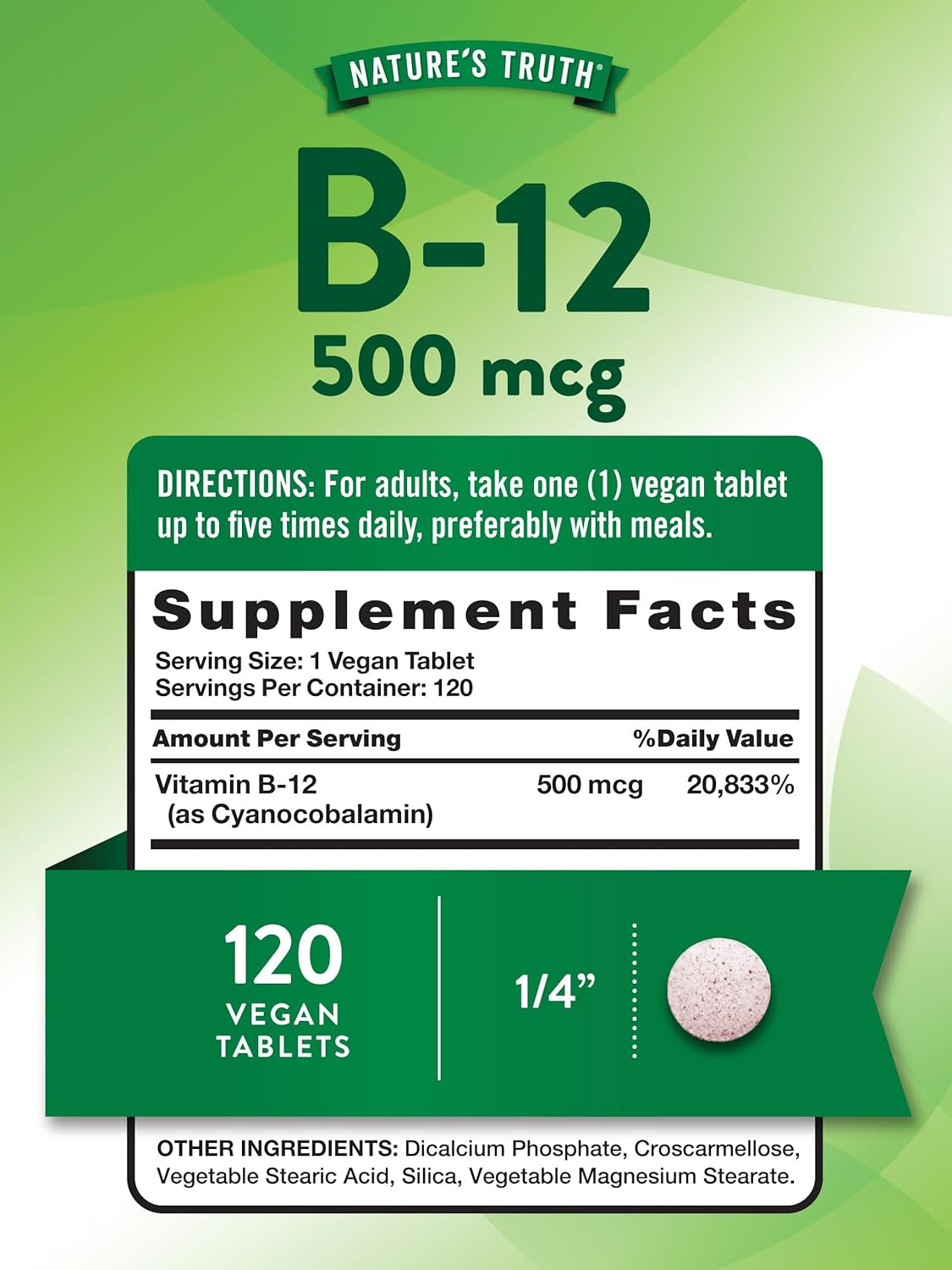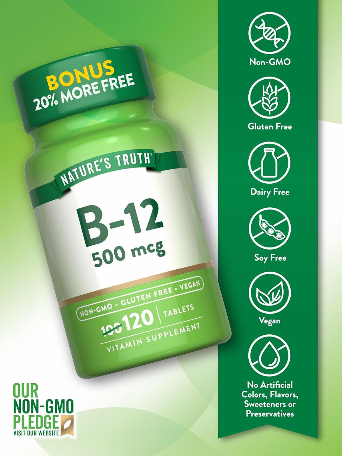 Nature'S Truth B12 Vitamin | 500 Mcg | 120 Tablets | Vegetarian, Non-Gmo & Gluten Free Supplement