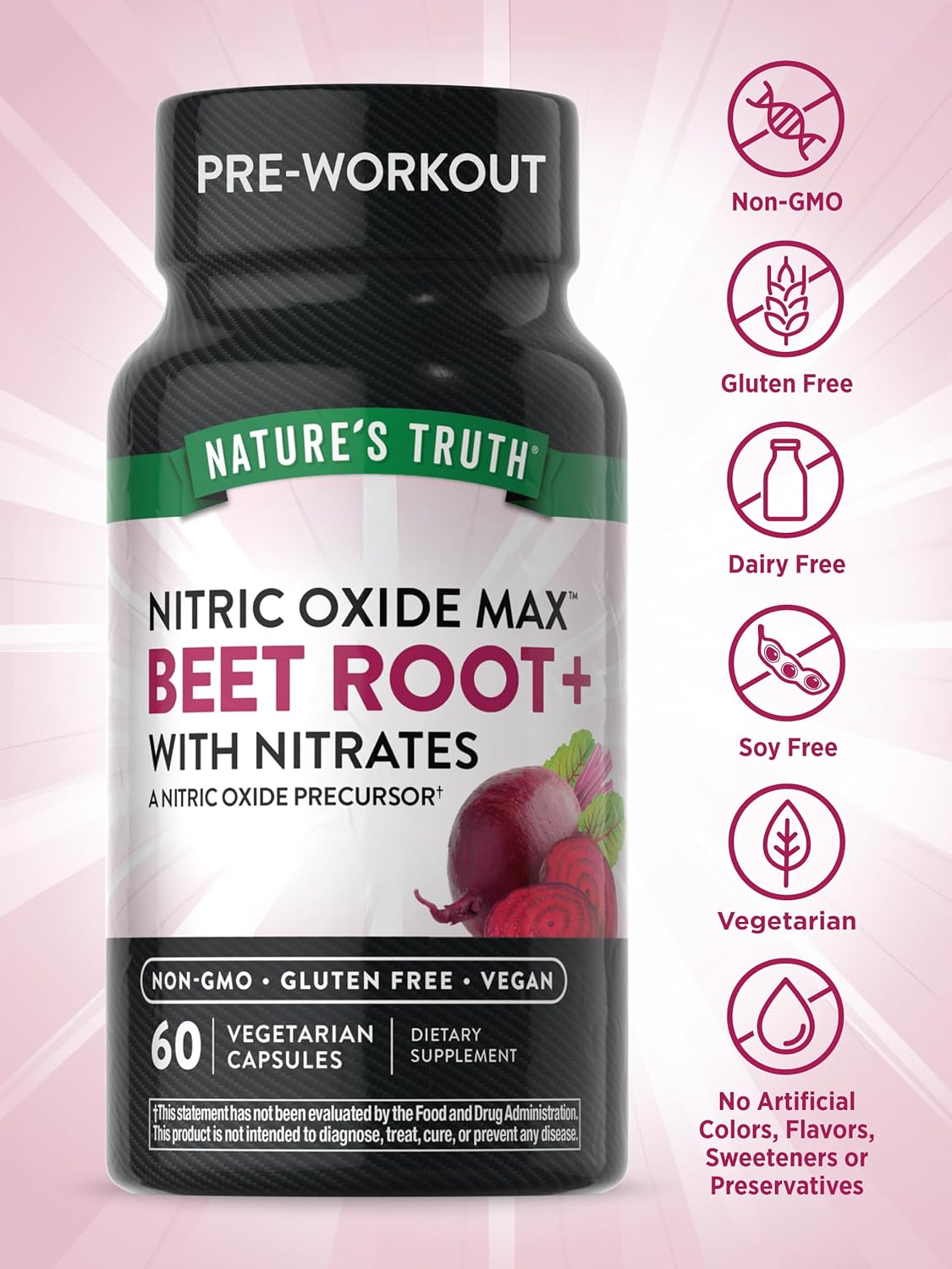 What Is Beet Root Beet Root Is A Nutrient-Rich Superfood That Is A Source Of Naturally Occurring Vitamins, Minerals, And Antioxidants. For Centuries, Beets Were Cultivated And Considered A Staple In Ancient Greece, Rome, And Egypt ā Sometimes Using Beet Root Juice To Add Color To Bland Foods. Beet Root Supplements Are A Wonderful Alternative For Those Who DonāT Love The Taste Of Beets Or Who Are Unable To Incorporate This Superfood Into Their Daily Diet. NatureāS Truth Nitric Oxide Max Beet Root Capsules NatureāS Truth Beet Root + Capsules With Nitrates Deliver A 3,000 Mg Nitric Oxide Precursor Blend Of Beet Root Powder, Beet Root Extract Equivalent, And Grape Seed Extract Equivalent. One Capsule Also Supplies An Excellent Source Of Vitamin C, Niacin, And Vitamin B-12, And Is Ideal For Men And Women To Take A Half Hour Pre-Workout Or Between Meals Up To Two Times Daily. NatureāS Truth: Where Wellness Begins Our Mission At NatureāS Truth Is To Meet Your Wellness Needs With Products That Go Above And Beyond. NatureāS Truth Provides Supplements In Various Delivery Forms, Such As Capsules, Softgels, Chewables, Tablets, Powders, Liquids, And Gummies To Suit Every Preference. Our Beet Root Is Vegan, Non-Gmo, And Free Of Gluten, Wheat, Yeast, Milk, Lactose, Soy, Artificial Color, Artificial Flavor, Artificial Sweetener, And Preservatives