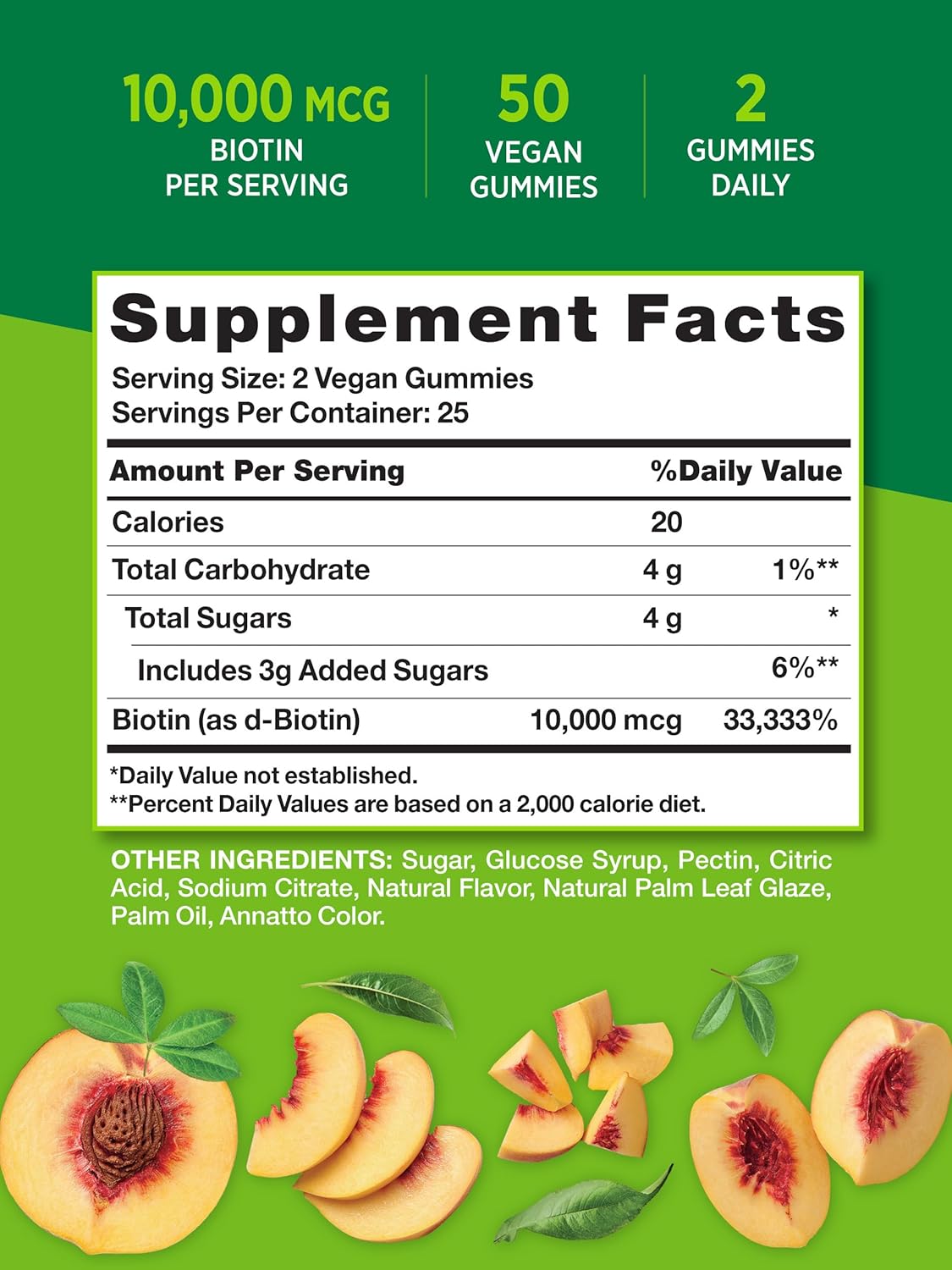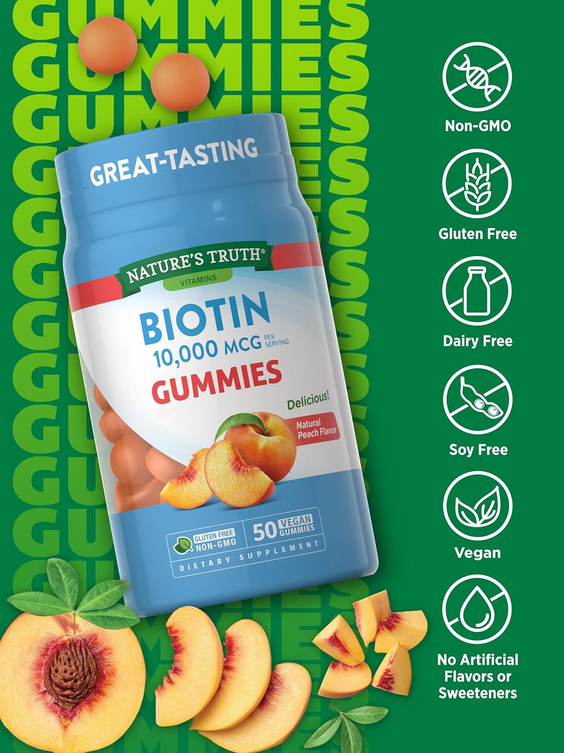 What Is Biotin Biotin, Also Known As Vitamin B-7, Is An Essential B Vitamin That The Body Needs A Fresh Supply Of Every Day, But Cannot Produce On Its Own. It Is Commonly Found In Food Sources Like Eggs, Organ Meats, Legumes, And Fish. Biotin Helps Support Your Daily Routine. Nature’S Truth Biotin Gummies Nature’S Truth Biotin Gummies Help Support Healthy Hair And Skin, With 10,000 Mcg Of Biotin Per Serving In Great Tasting Peach-Flavored Gummies.* Men And Women Can Satisfy Their Daily Requirement For This Essential B Vitamin With Two Delicious Vegan Gummies Per Day. Nature’S Truth: Where Wellness Begins Our Mission At Nature’S Truth Is To Meet Your Wellness Needs With Products That Go Above And Beyond. Nature’S Truth Provides Supplements In Various Delivery Forms, Such As Capsules, Softgels, Chewables, Tablets, Powders, Liquids, And Gummies To Suit Every Preference. Our Biotin Gummies Are Vegan, Non-Gmo, And Free Of Gluten, Wheat, Yeast, Milk, Lactose, Soy, And Artificial Sweetener. *This Statement Has Not Been Evaluated By The Food And Drug Administration. This Product Is Not Intended To Diagnose, Treat, Cure, Or Prevent Any Disease