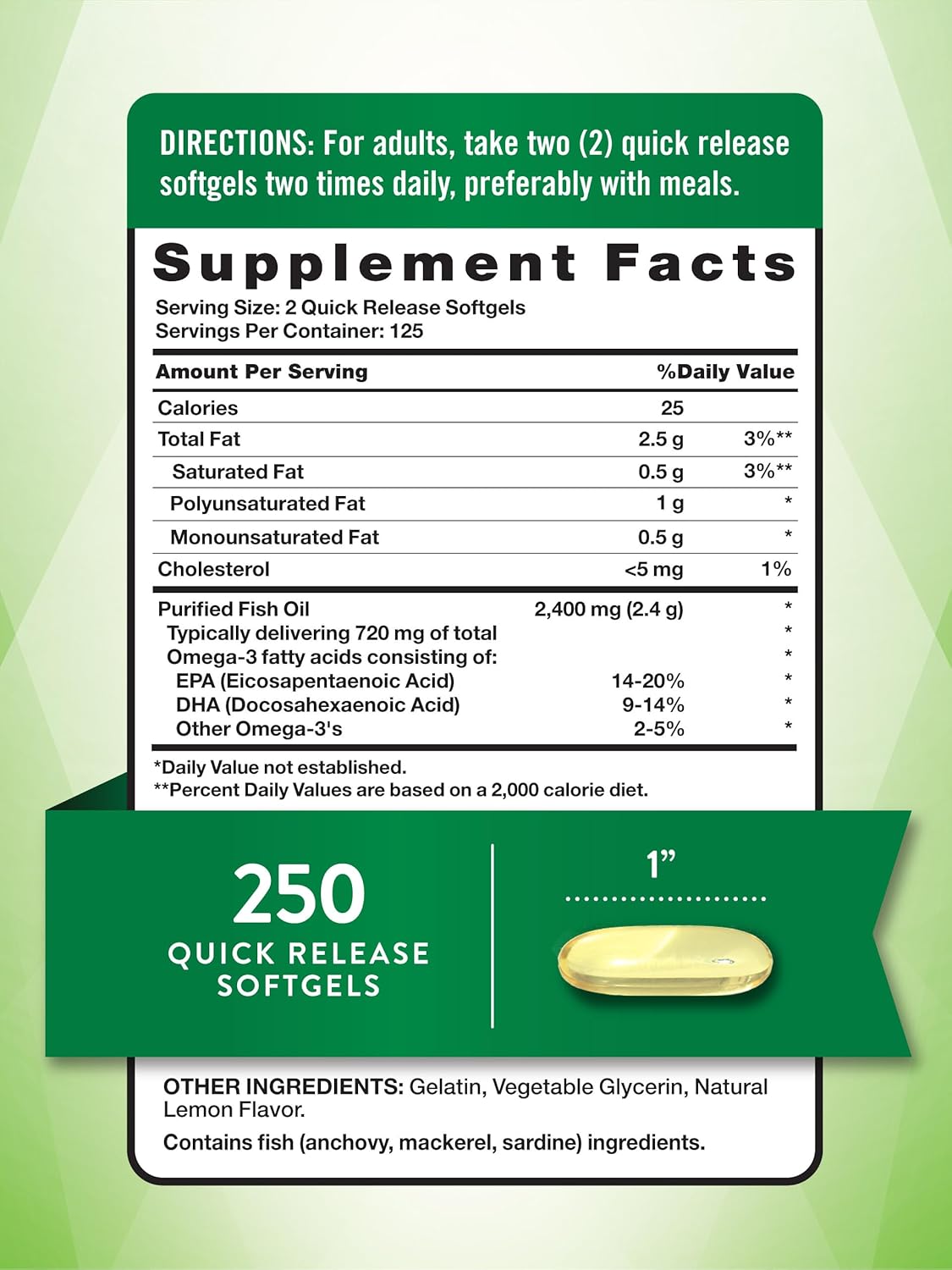 What Is Fish Oil Fish Oil Is A Source Of Omega-3 Fatty Acids, Which The Body Uses For Various Functions As They Contain A Variety Of Naturally Occurring Nutrients. Two Important Omega-3 Fatty Acids Are Docosahexaenoic Acid (Dha) And Eicosapentaenoic Acid (Epa). These Fatty Acids Can Be Derived From Food Sources Such As Salmon, Shellfish, And Trout; But For Those Who DonāT Eat These Fish Every Day, A Trusted Supplement Can Be A Reliable Source. NatureāS Truth Fish Oil Softgels Each Serving Of Our Fish Oil Softgels Provides 2,400 Mg Of Purified Fish Oil, Which Contains 720 Mg Of Total Omega-3 Fatty Acids Consisting Of Epa, Dha, And Other Omega-3S. These Quick Release Softgels Are A Natural Lemon Flavor Which Helps To Control Fish Burps, A Common Occurrence Associated With Fish Oil Supplements. Our Formula Is Also Purified To Eliminate Mercury. NatureāS Truth: Where Wellness Begins Our Mission At NatureāS Truth Is To Meet Your Wellness Needs With Products That Go Above And Beyond. NatureāS Truth Provides Supplements In Various Delivery Forms, Such As Capsules, Softgels, Chewables, Tablets, Powders, Liquids, And Gummies To Suit Every Preference. Our Fish Oil Is Non-Gmo And Free Of Gluten, Wheat, Yeast, Milk, Lactose, Artificial Color, Artificial Flavor, Artificial Sweetener, And Preservatives