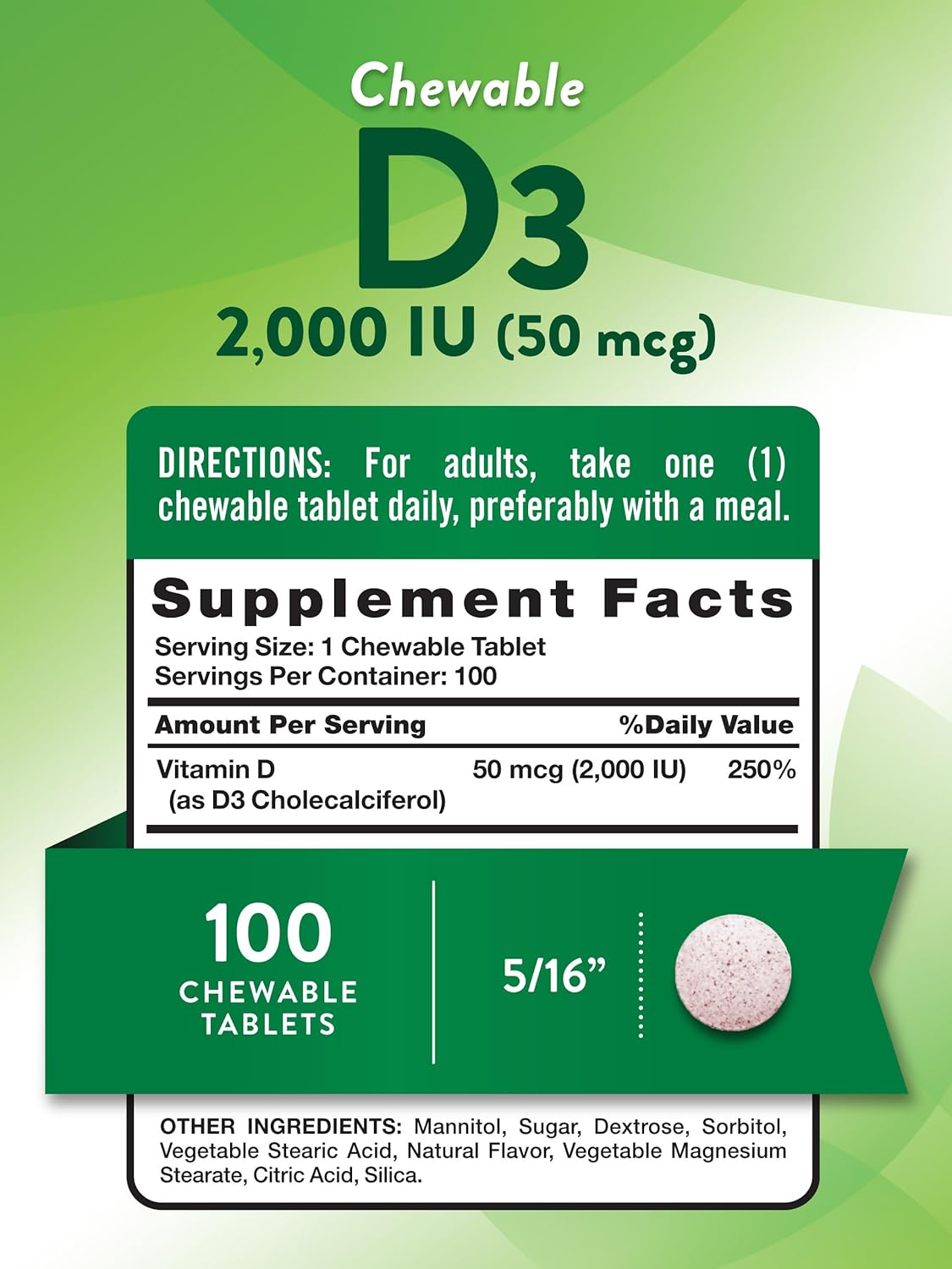 What Is Vitamin D3 Vitamin D3 Is An Essential Vitamin That Is Known As The “Sunshine Vitamin” Because Of The Body’S Ability To Naturally Produce It After Exposure To Sunlight. Vitamin D3 Is Especially Beneficial To Those Who Spend A Lot Of Time Indoors Or Those Who Wear Sunscreen Regularly To Protect Their Skin While Outdoors. Nature’S Truth Chewable Vitamin D3 Tablets Each Serving Of Our Chewable Vitamin D3 Tablets Delivers 50 Mcg Or 2,000 Iu Of Vitamin D As D3 Cholecalciferol. These Chewable Vegetarian Tablets Are A Delicious Berry Flavor And A Wonderful Alternative For Those Who Dislike Or Have Trouble Swallowing Pills. Just One Chewable Tablet Per Day Is All You Need To Meet The Daily Recommended Value Of This Essential Vitamin. Nature’S Truth: Where Wellness Begins Our Mission At Nature’S Truth Is To Meet Your Wellness Needs With Products That Go Above And Beyond. Nature’S Truth Provides Supplements In Various Delivery Forms, Such As Capsules, Softgels, Chewables, Tablets, Powders, Liquids, And Gummies To Suit Every Preference. Our Vitamin D3 Is Vegetarian, Non-Gmo, And Free Of Gluten, Wheat, Yeast, Milk, Lactose, Soy, And Artificial Color