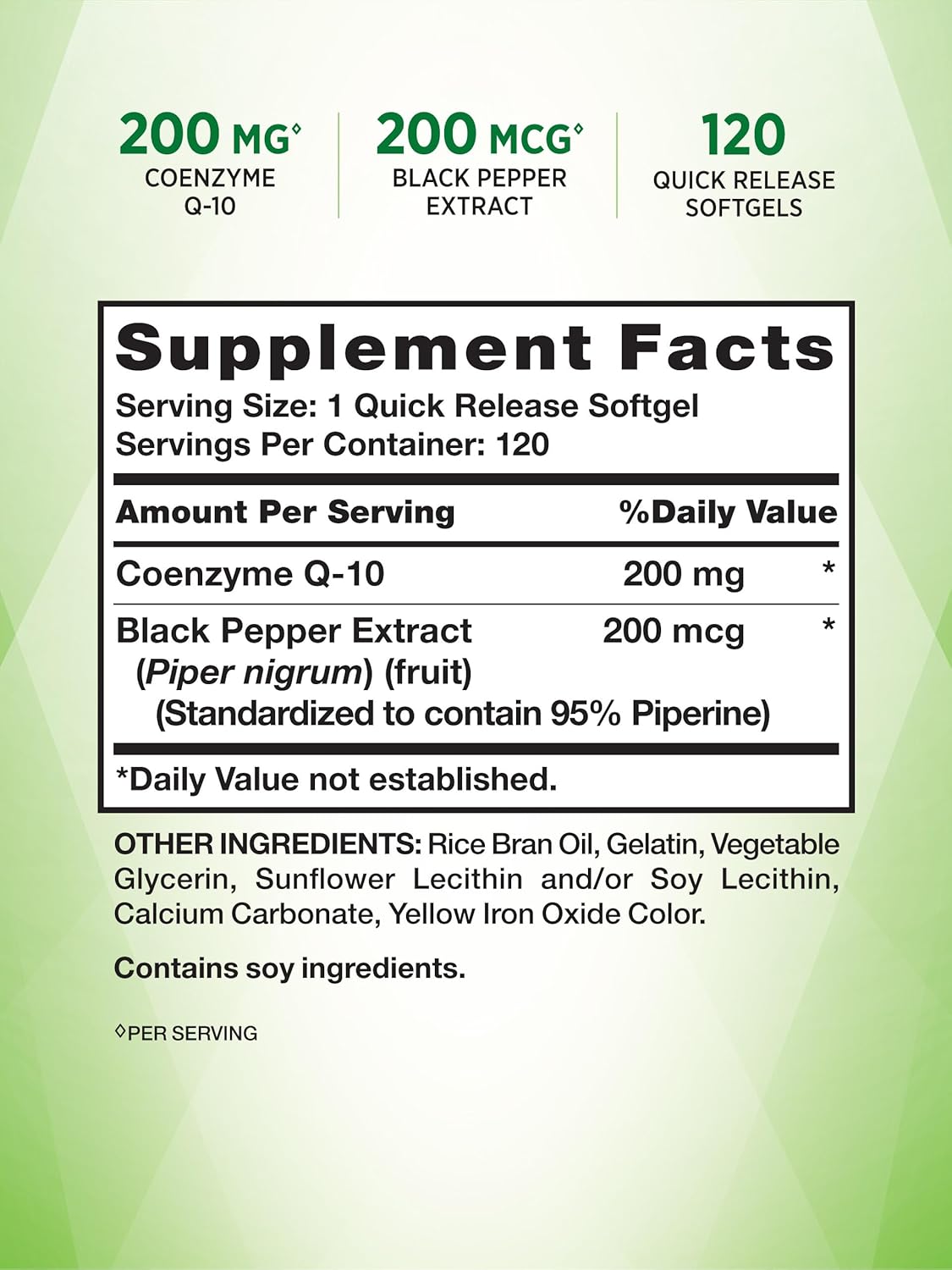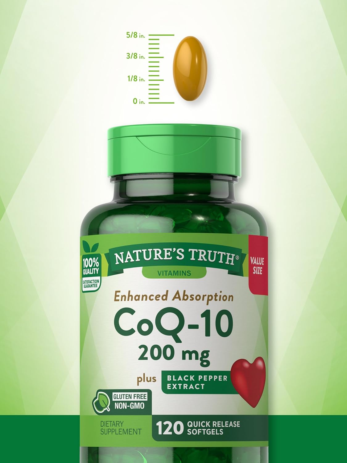 Coenzyme Q10: Each Quick Release Softgel Provides 200 Mg Of Coq10, A Natural Antioxidant Compound10Enhanced Absorption: Optimized With Black Pepper Extract For Enhanced Daily Support For Adults10Honest & Transparent: NatureāS Truth Is Committed To Delivering The Best Quality Wellness Products10Experts You Can Trust: Backed By Three Generations Of Vitamin Innovators For Unrivaled Quality10Naturally Free Of: Gluten, Wheat, Milk, Lactose, Artificial Sweetener & Flavor, And Non-Gmo10What Is Coq-10 ? Coq-10, Or Coenzyme-10, Is An Important Antioxidant Compound Naturally Found In Nearly Every Cell Of The Body. ** Coq-10 Levels May Begin To Decline With Age, So Many People Reach For A Trusted High-Quality Supplement To Receive Daily Support. NatureāS Truth Coq-10 Softgels Each Quick Release Softgel Provides 200 Mg Of Coenzyme Q-10, As Well As 200 Mcg Of Black Pepper Extract, Derived From The Fruit Of Piper Nigrum. This Added Herbal Support Of Black Pepper Extract Aids In The Absorption Of Coq-10 To Allow For Enhanced Support. This Value Size Bottle Provides 120 Softgels, Which Will Last You Several Months! NatureāS Truth: Where Wellness Begins Our Mission At NatureāS Truth Is To Meet Your Wellness Needs With Products That Go Above And Beyond. NatureāS Truth Provides Supplements In Various Delivery Forms, Such As Capsules, Softgels, Chewables, Tablets, Powders, Liquids, And Gummies To Suit Every Preference. Our Coq-10 Is Non-Gmo And Free Of Gluten, Wheat, Yeast, Milk, Lactose, Artificial Flavor, Artificial Sweetener, And Preservatives. **These Statements Have Not Been Evaluated By The Food And Drug Administration. This Product Is Not Intended To Diagnose, Treat, Cure, Or Prevent Any Disease