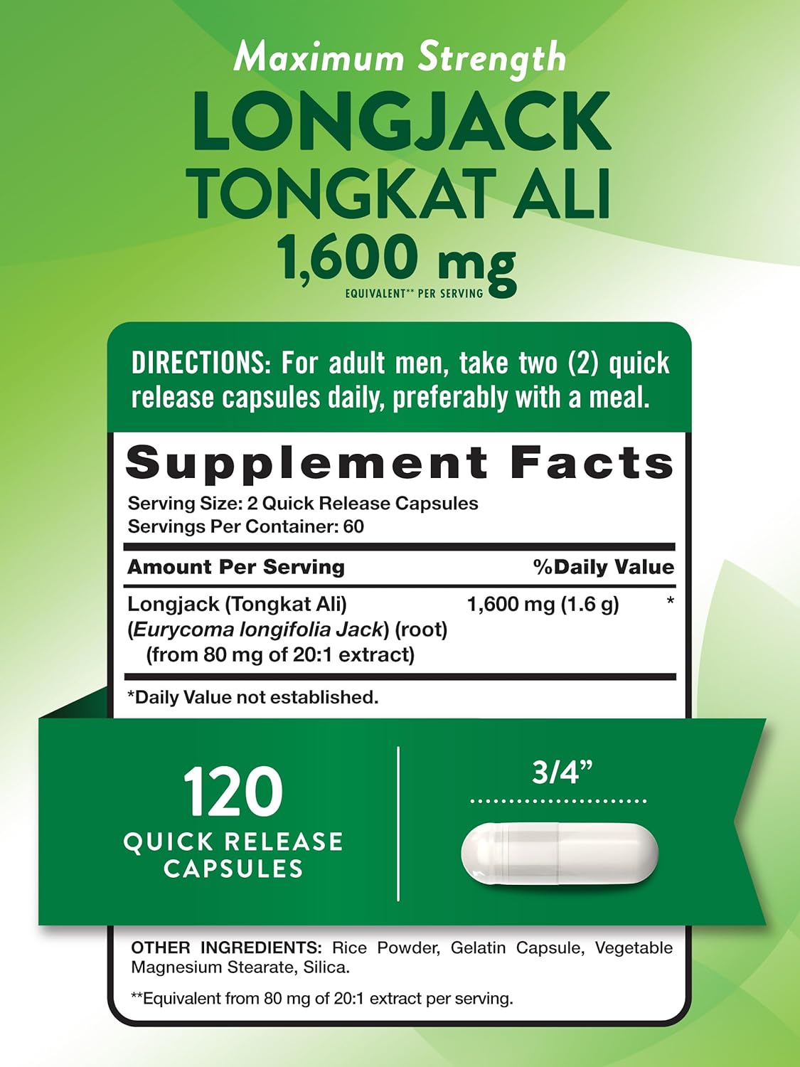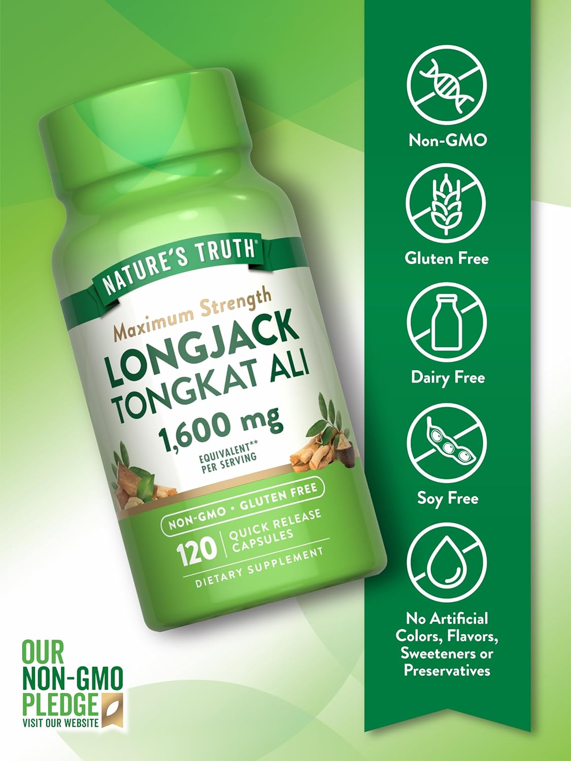 What Is Longjack Tongkat Ali Longjack Tongkat Ali Is A Traditional Herb That Is Derived From The Root Of Eurycoma Longifolia Jack, A Flowering Green Shrub That Is Native To Southeast Asia. Also Known As āTongkat Ali,ā This Herb Has Been Widely Revered By Men For Centuries, With Diverse Cultures Finding It Valuable For Their Encounters. NatureāS Truth Longjack Tongkat Ali Capsules These Concentrated Quick Release Capsules Deliver The Equivalent Of 1,600 Mg Of Longjack Per Serving, From 80 Mg Of A 20:1 Extract.** This Maximum Strength Male Formula Provides Quality Plant-Based Support That Is Not Usually Found In Large Amounts Within Typical Diets. Men All Over The World Have Taken Tongkat Ali In Anticipation Of Crucial Moments. NatureāS Truth: Where Wellness Begins Our Mission At NatureāS Truth Is To Meet Your Wellness Needs With Products That Go Above And Beyond. NatureāS Truth Provides Supplements In Various Delivery Forms, Such As Capsules, Softgels, Chewables, Tablets, Powders, Liquids, And Gummies To Suit Every Preference. Our Longjack Tongkat Ali Capsules Are Non-Gmo, And Free Of Gluten, Wheat, Yeast, Milk, Lactose, Soy, Artificial Color, Artificial Flavor, Artificial Sweetener, And Preservatives. **Equivalent From 80 Mg Of 20:1 Extract Per Serving