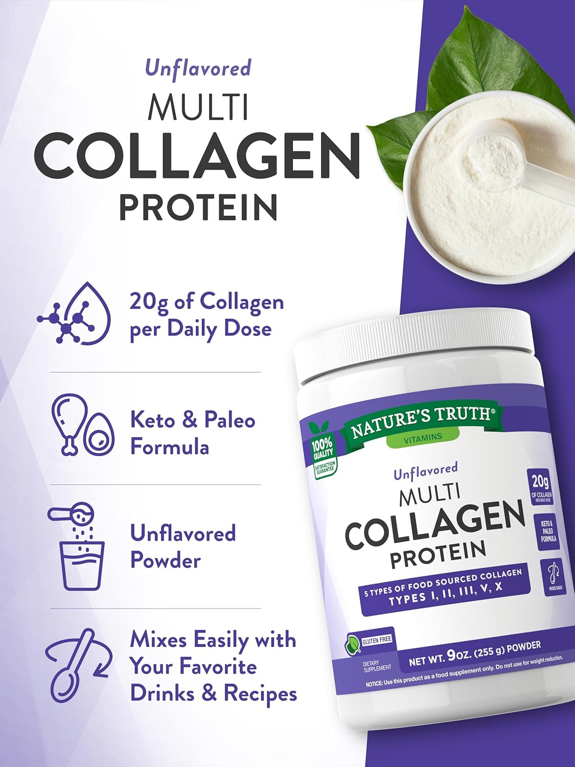 Nature'S Truth Multi Collagen Powder | 9 Oz | Type I, Ii, Iii, V, X | Hydrolyzed Collagen Peptide Protein Powder | Keto And Paleo Friendly | Unflavored | Gluten Free