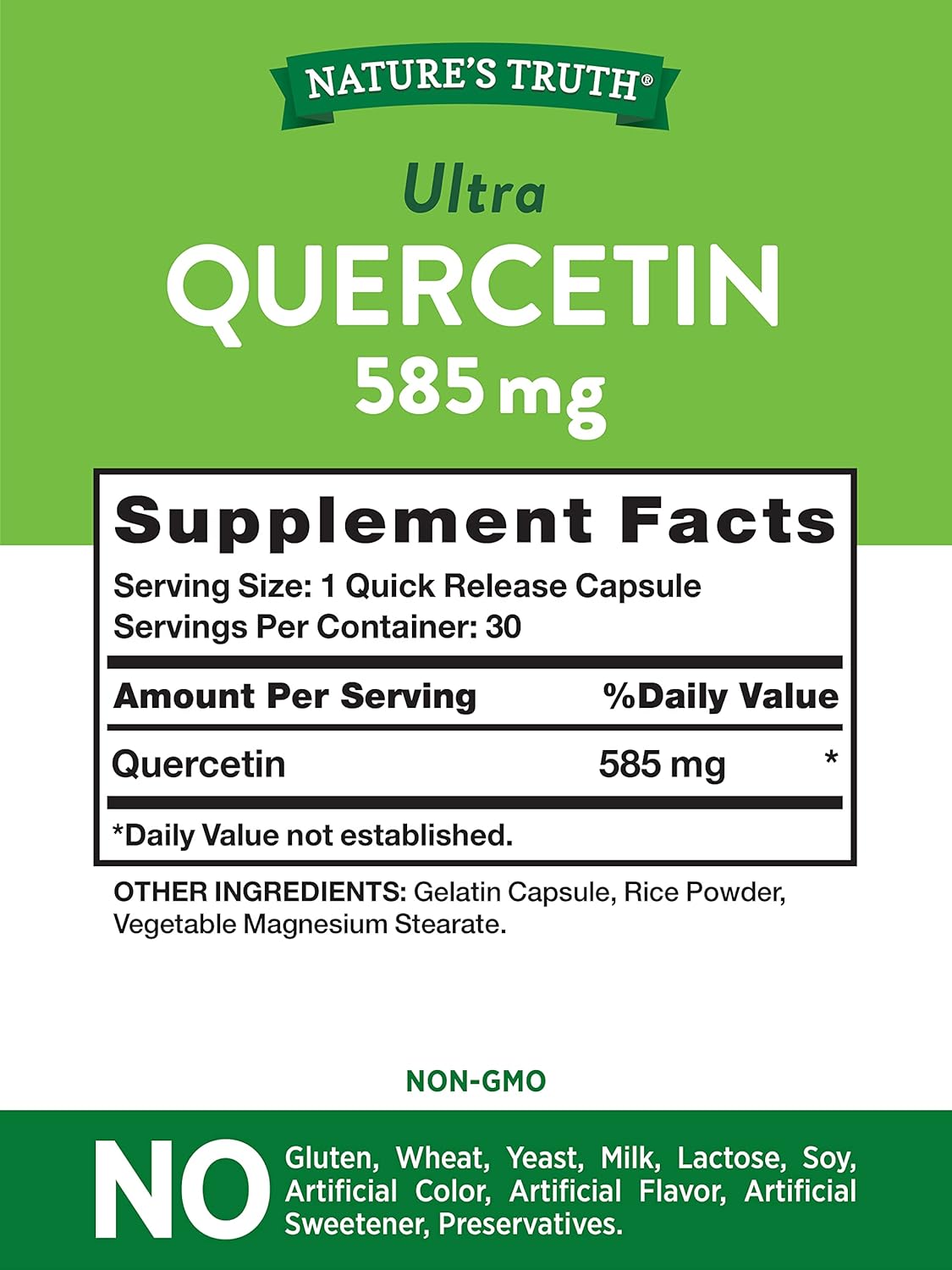 Add A Plant-Based Antioxidant To Your Day With NatureāS TruthĀ® Ultra Quercetin! A Convenient Dose Of One Capsule A Day Supplies You With 585 Mg Of Quercetin To Meet Your Needs. Quercetin Is A Pigment That Belongs To A Group Of Plant Compounds Called Flavonoids. Naturally Found In Fruits And Vegetables Like Grapes, Onions, Apples And Oranges, Quercetin Is A Potent Bioflavonoid Known For Its Antioxidant Properties. Our Formula Takes The Guesswork Out Of Getting Your Daily Quercetin ā One Quick Release Capsule Provides You This Important Nutrient. We Know How Important It Is To Feel Your Best, Which Is Why We Use Only High-Quality Ingredients To Create Our Ultra Quercetin Quick Release Capsules. They Are Non-Gmo, Gluten Free, Wheat Free, Yeast Free, Milk Free, Lactose Free, And Soy Free, And Are Created Without Any Artificial Colors, Flavors, Sweeteners Or Preservatives