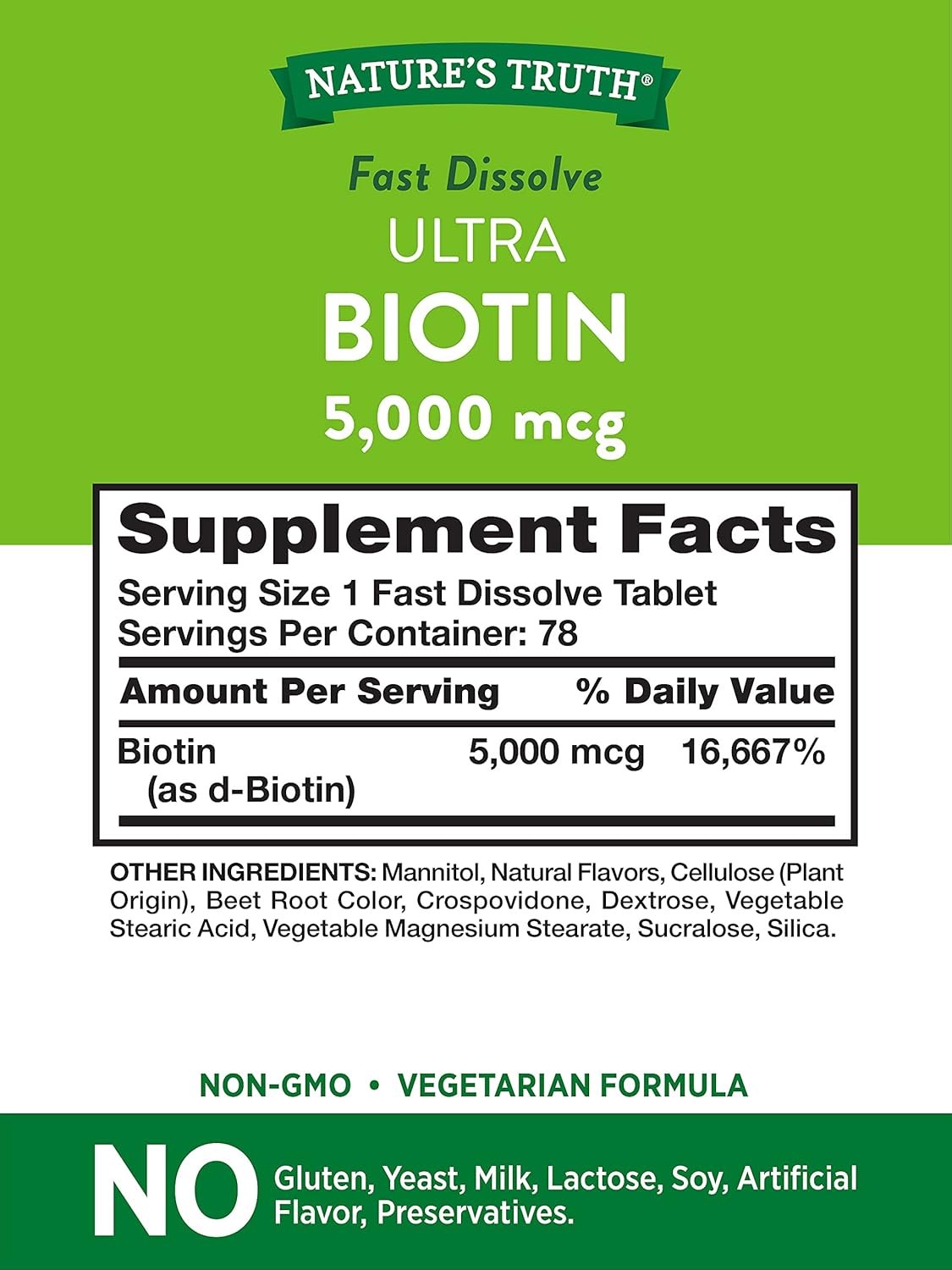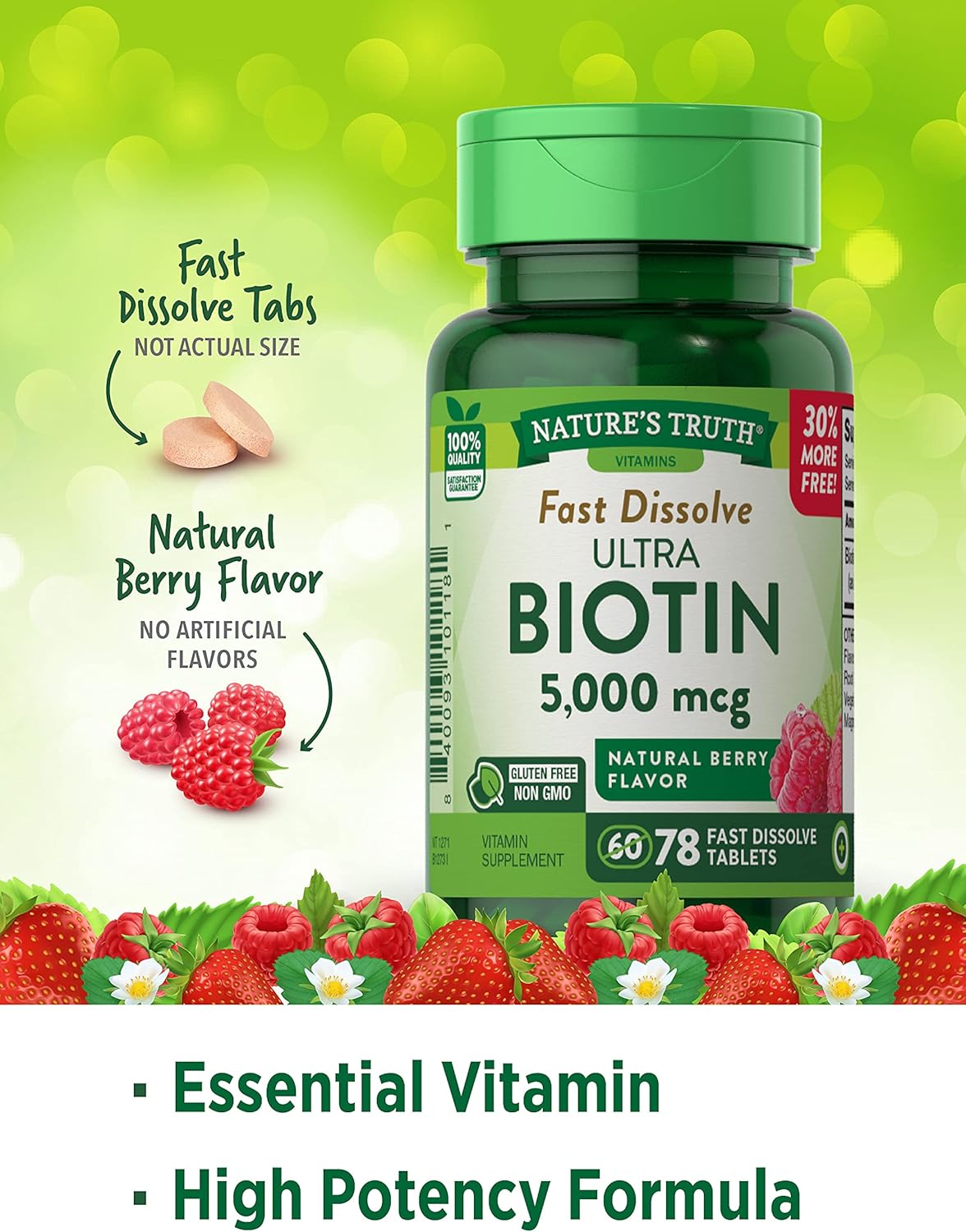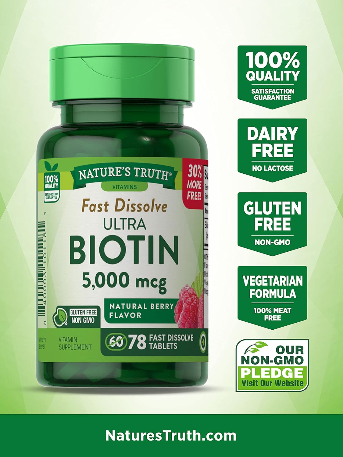 Nature'S Truth Ultra Biotin 5000Mcg | 78 Fast Dissolve Tablets | Hair Skin And Nails Supplement | Natural Berry Flavor | Vegetarian, Non-Gmo, Gluten Free
