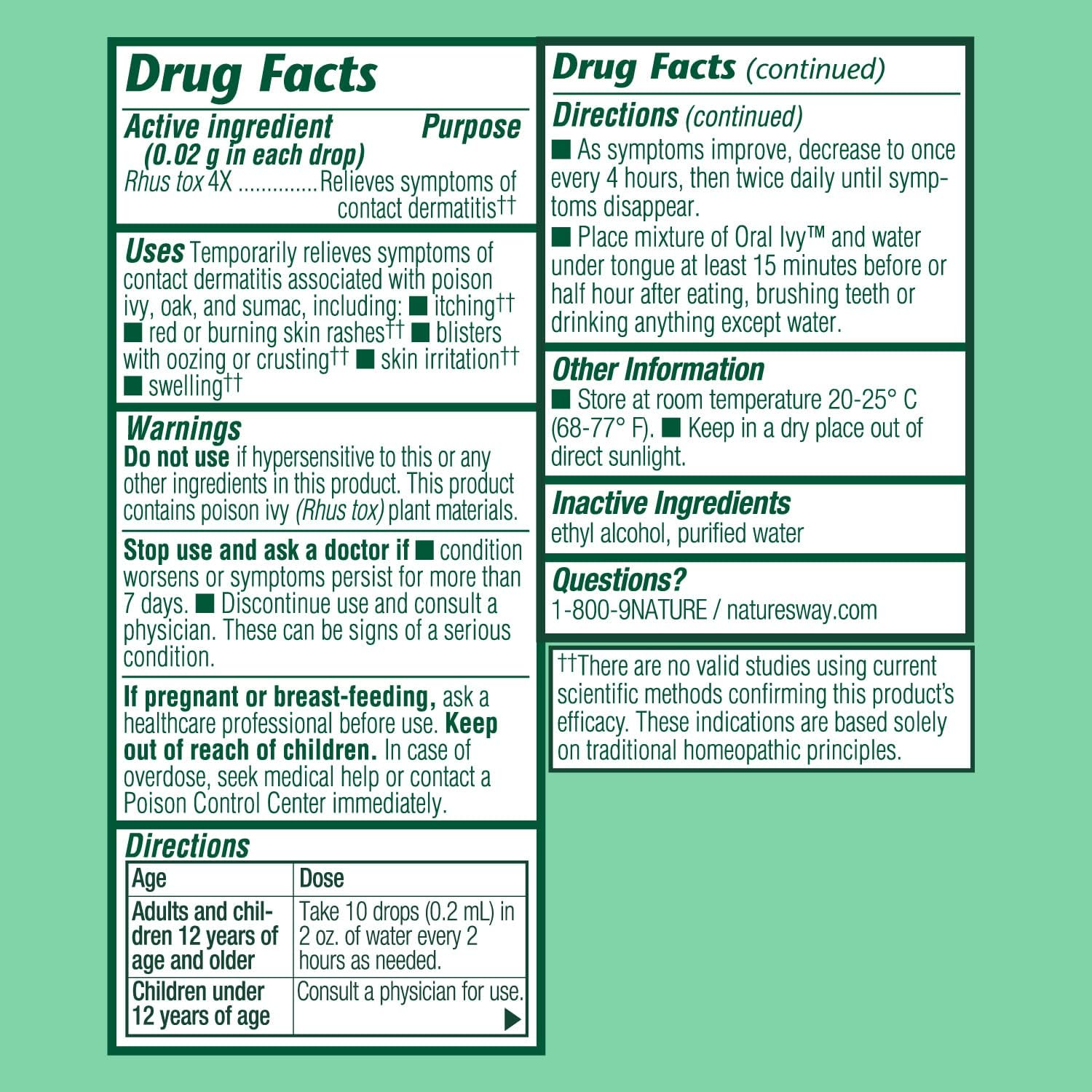 For The Temporary Relief Of Contact Dermatitis Associated With Poison Ivy, Poison Oak Or Poison Sumac.†† Temporarily Relieves Itching, Red Or Burning Skin Rashes, Blisters With Oozing Or Crusting, And Skin Irritation Or Swelling.†† Relieves Symptoms Of Poison Ivy, Oak & Sumac.†† Easy-To-Take Liquid.*This Statement Has Not Been Evaluated By The Food And Drug Administration. This Product Is Not Intended To Diagnose, Treat, Cure, Or Prevent Any Disease.††There Are No Valid Studies Using Current Scientific Methods Confirming This Product'S Efficacy. These Indications Are Based Solely On Traditional Homeopathic Principles