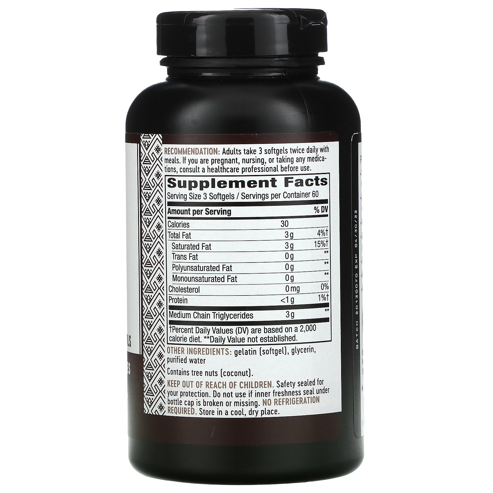 Since 1969 100% Potency No Filler Oils Medium Chain Triglycerides 3 g Per Serving‡ Dietary Supplement Gluten-Free BPA Free Pure Source MCTs: 100% MCTs‡: 3 g of MCTs per serving. Quickly digested and converted into energy for your brain and body. Helps you to feel full. Only from premium coconuts - no palm or other filler oils. Flavorless and odorless. Hexane-free. MCTs in convenient softgel form. ‡See supplement facts for total fat and saturated fat content. Since 1969 100% Potency No Filler Oils Medium Chain Triglycerides 3 g Per Serving‡