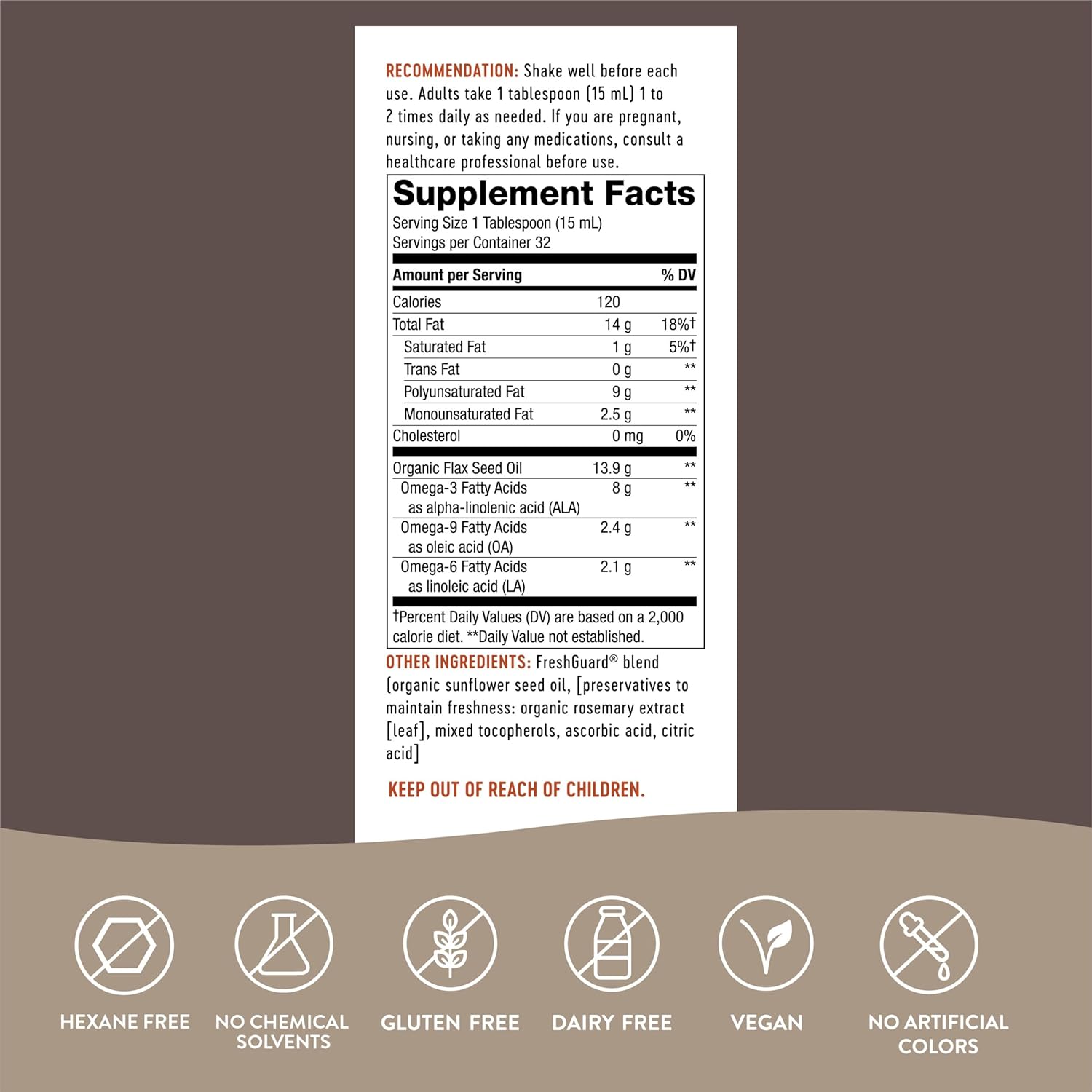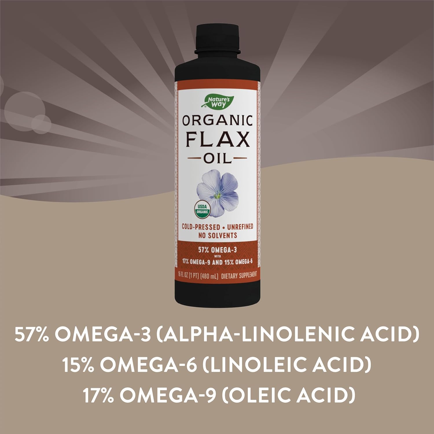 Organic Flax Oil Is Cold-Pressed And Unrefined10Contains 57% Omega-3 (Alpha Linolenic Acid), 15% Omega-6 (Linoleic Acid), And 17% Omega-9 (Oleic Acid)10Hexane-Free With No Chemical Solvents10Light Protective Bottles And Nitrogen-Flushed Packaging Keeps Oil Fresh10Gluten-Free And Vegan. No Salt, Yeast-Derived Ingredients, Wheat, Dairy, Or Artificial Colors10Flax Has Historically Been Cultivated For Thousands Of Years And Has Been Used For A Variety Of Reasons Including For Its Textile Components And Therapeutic Properties. Natures Way Organic Flax Oil Delivers 57% Omega-3 And 15% Omega-6 Essential Fatty Acids, Along With 17% Omega-9, Which Are A Key Part Of Your Everyday Diet.*This Statement Has Not Been Evaluated By The Food And Drug Administration. This Product Is Not Intended To Diagnose, Treat, Cure, Or Prevent Any Disease