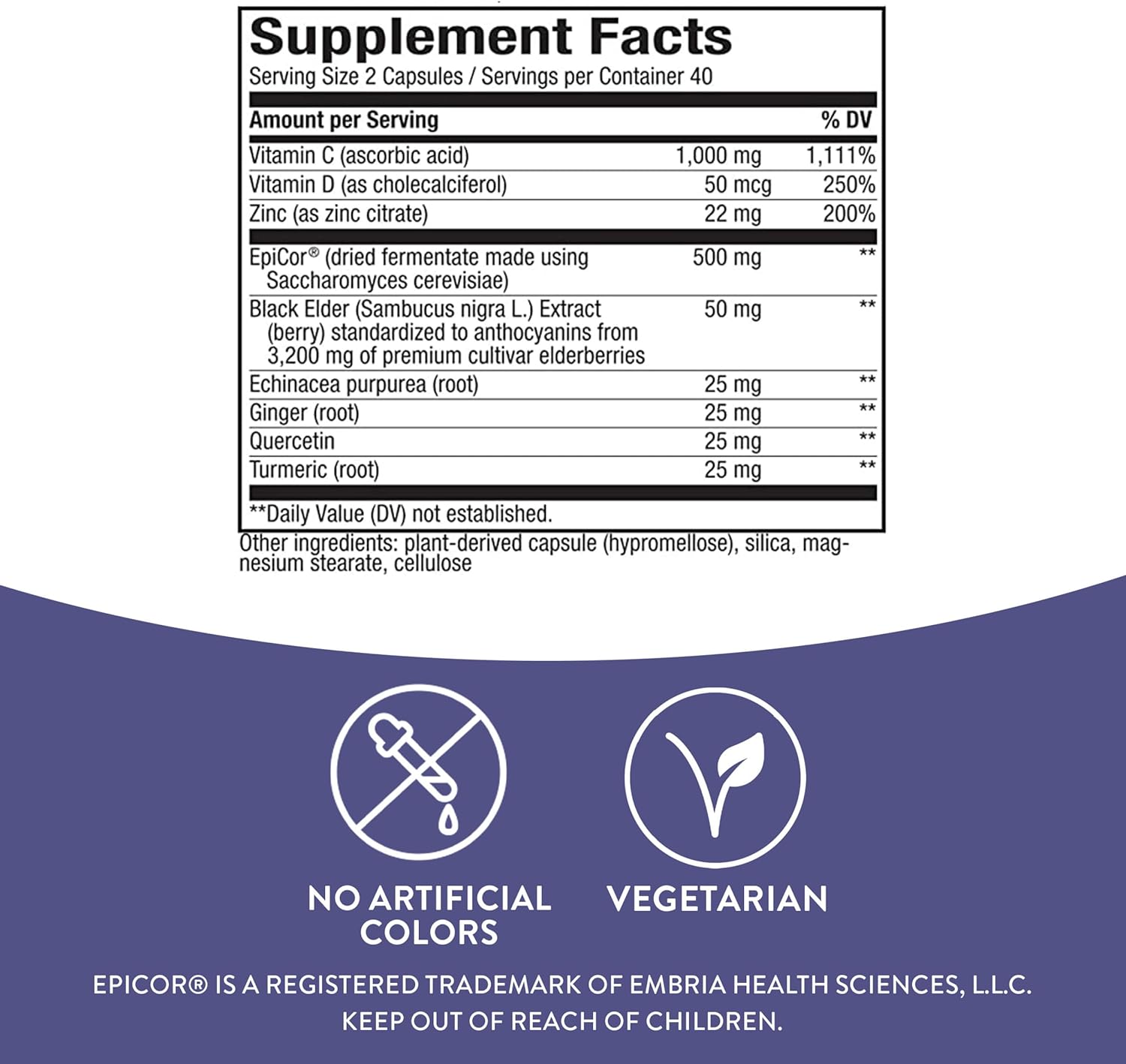 Sometimes you need more than just daily immune support you need to take things to the next level.* Sambucus Advanced Immune is made with the clinically tested immune booster EpiCor to activate immune cells in 2 hours for rapid response support.* ** The 9-in-1 formula includes EpiCor, highly concentrated black elderberry extract, high potency zinc, vitamin C, and vitamin D, and quercetin, echinacea, ginger, and turmeric. Vitamin C provides powerful antioxidant action.* Our 64x concentrated black elderberry extract is standardized to anthocyanins, which provide antioxidant support.* Each 2-capsule serving is made from 3,200 mg of elderberries. (**EpiCor has been shown to help activate immune system natural killer cells in a published human study. Results observed in as little as two hours. Individual results may vary.) EpiCor is a registered trademark of Embria Health Sciences, L.L.C.*This statement has not been evaluated by the Food and Drug Administration. This product is not intended to diagnose, treat, cure, or prevent any disease