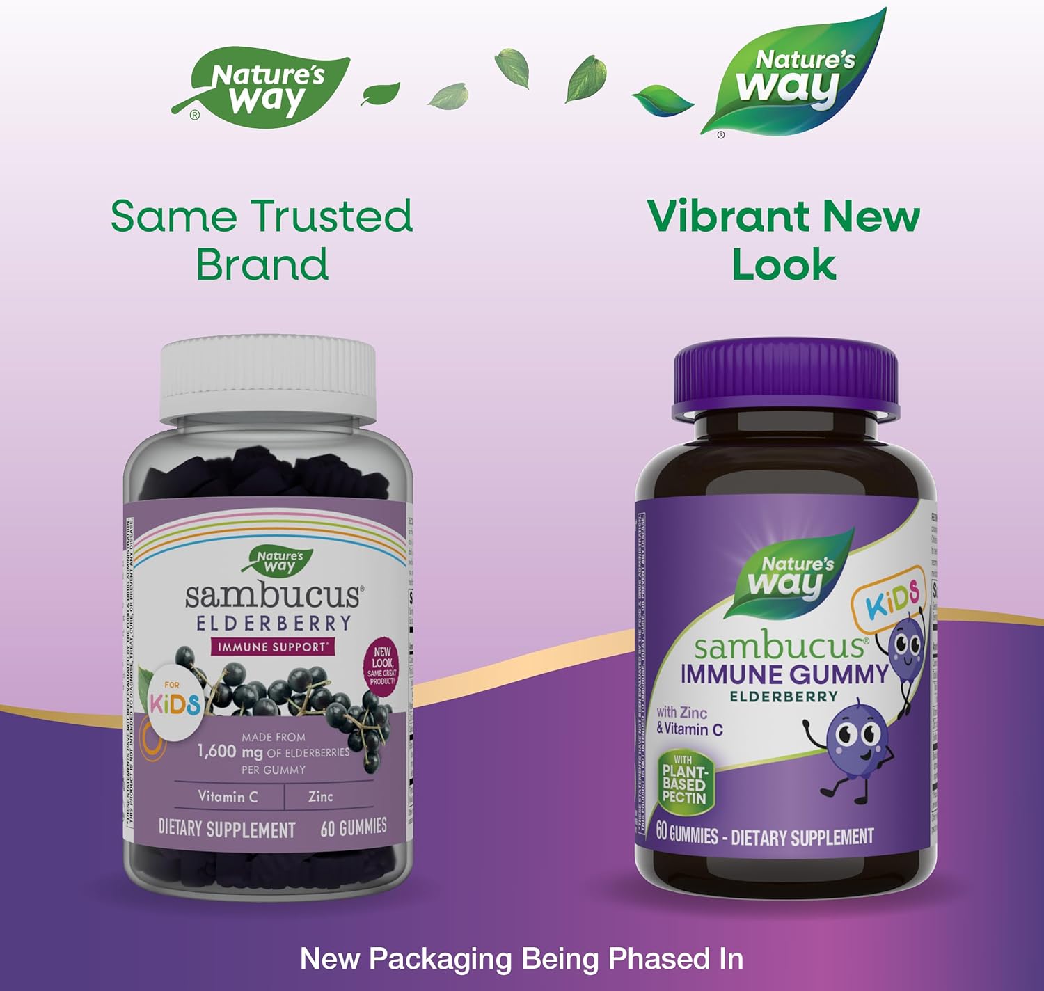 Nature'S Way Sambucus Elderberry Immune Gummies For Kids, Immune Support Gummies*, With Black Elderberry Extract, Vitamin C And Zinc, 60 Gummies (Packaging May Vary)