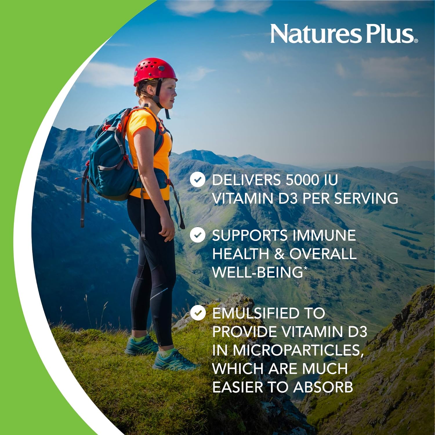 DESCRIPTION : NaturesPlus Immune Vitamin D3 5000 IU - 60 Softgels - Supports Immune Health & Overall Well-Being - Emulsified for Maximum Absorption - Gluten Free - 60 Servings