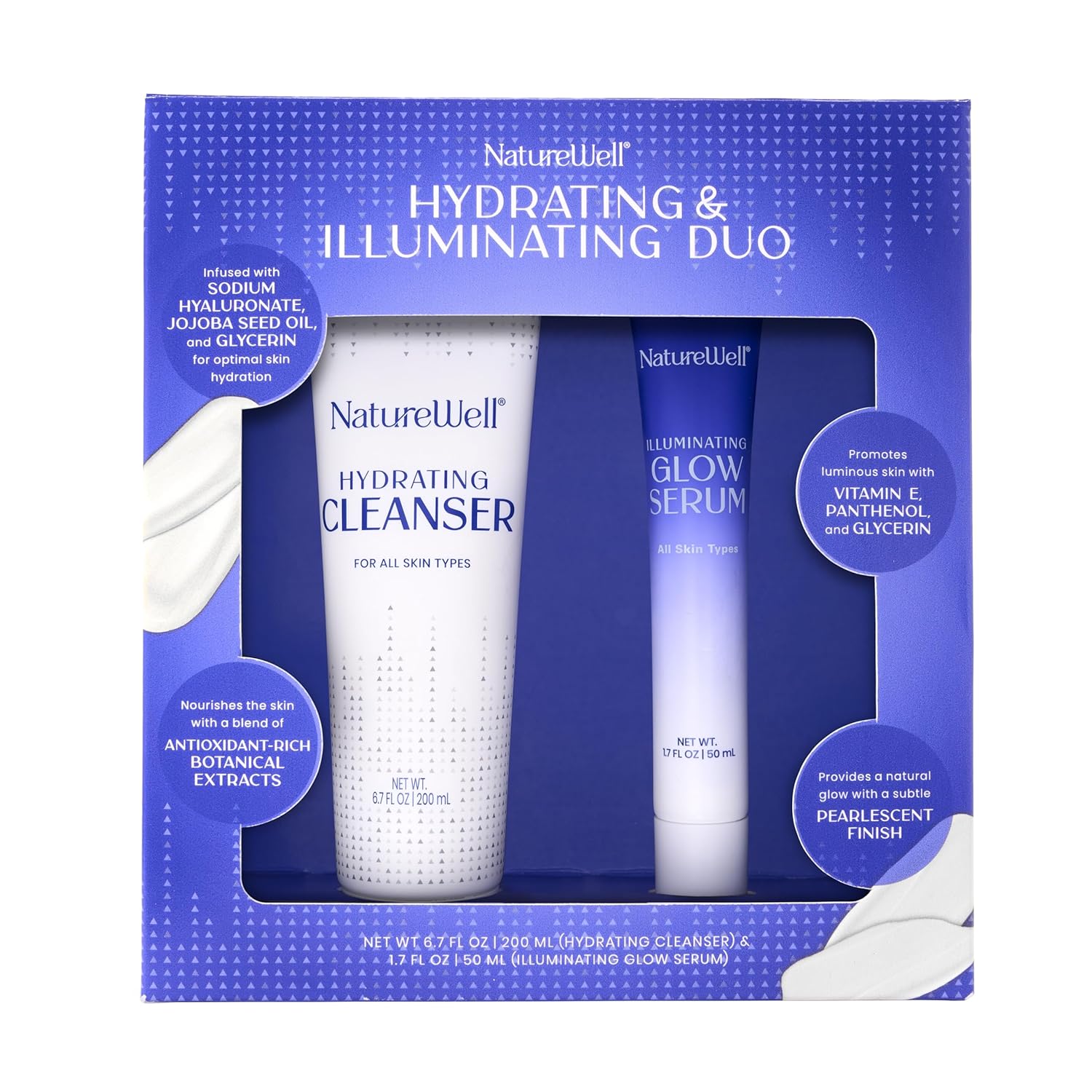 About this item Deep Cleanse with Lasting Hydration: The Hydrating Cleanser is expertly formulated to cleanse the skin while helping to lock in moisture. Enriched with glycerin, sodium hyaluronate, and jojoba seed oil, it leaves your skin feeling soft, smooth, and refreshed. With the added benefits of niacinamide and squalane, this cleanser helps enhance your skin’s natural glow, making it visibly more radiant with every wash. Glow On with Effortless Radiance: Follow with the Illuminating Glow Serum to elevate your skincare routine. Infused with Vitamin E, panthenol, and antioxidant-rich botanicals, the serum glides effortlessly over the skin for a luxurious feel. A subtle pearlescent finish helps add a natural-looking radiance, leaving your complexion smooth, luminous, and perfectly prepped. Lightweight Formulas for Daily Use: Both products in the duo are designed with lightweight, fast-absorbing textures, making them perfect for daily use. Whether used together or individually, they integrate seamlessly into your skincare routine and can be used under makeup or on bare skin for a hydrated, dewy look. Day-to-Night Skincare Simplicity: Whether you're starting your day or unwinding before bed, NatureWell's Hydrating & Illuminating Duo makes self-care feel effortless. The gentle yet effective formulas work around the clock to nourish, replenish, and refresh your skin—no complicated steps required. About NatureWell: NatureWell is a nature-inspired, problem-to-solution personal care brand that creates clean, effective skincare for all. Products like the Hydrating & Illuminating Duo reflect our mission: to make nourishing self-care simple, accessible, and empowering. Every formula is crafted with better-for-you ingredients, cruelty-free standards, and a commitment to helping you look and feel your best—naturally. › See more product details,Deep Cleanse with Lasting Hydration: The Hydrating Cleanser is expertly formulated to cleanse the skin while helping to lock in moisture. Enriched with glycerin, sodium hyaluronate, and jojoba seed oil, it leaves your skin feeling soft, smooth, and refreshed. With the added benefits of niacinamide and squalane, this cleanser helps enhance your skin’s natural glow, making it visibly more radiant with every wash,Glow On with Effortless Radiance: Follow with the Illuminating Glow Serum to elevate your skincare routine. Infused with Vitamin E, panthenol, and antioxidant-rich botanicals, the serum glides effortlessly over the skin for a luxurious feel. A subtle pearlescent finish helps add a natural-looking radiance, leaving your complexion smooth, luminous, and perfectly prepped,Lightweight Formulas for Daily Use: Both products in the duo are designed with lightweight, fast-absorbing textures, making them perfect for daily use. Whether used together or individually, they integrate seamlessly into your skincare routine and can be used under makeup or on bare skin for a hydrated, dewy look,Day-to-Night Skincare Simplicity: Whether you're starting your day or unwinding before bed, NatureWell's Hydrating & Illuminating Duo makes self-care feel effortless. The gentle yet effective formulas work around the clock to nourish, replenish, and refresh your skin—no complicated steps required,About NatureWell: NatureWell is a nature-inspired, problem-to-solution personal care brand that creates clean, effective skincare for all. Products like the Hydrating & Illuminating Duo reflect our mission: to make nourishing self-care simple, accessible, and empowering. Every formula is crafted with better-for-you ingredients, cruelty-free standards, and a commitment to helping you look and feel your best—naturally