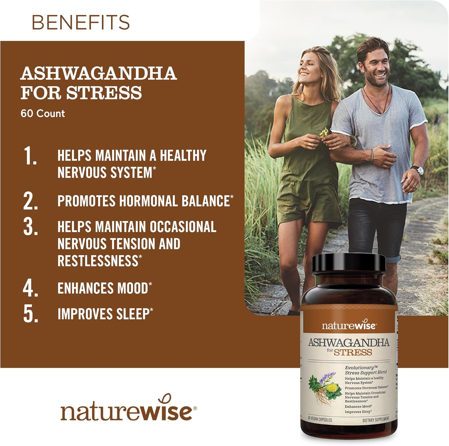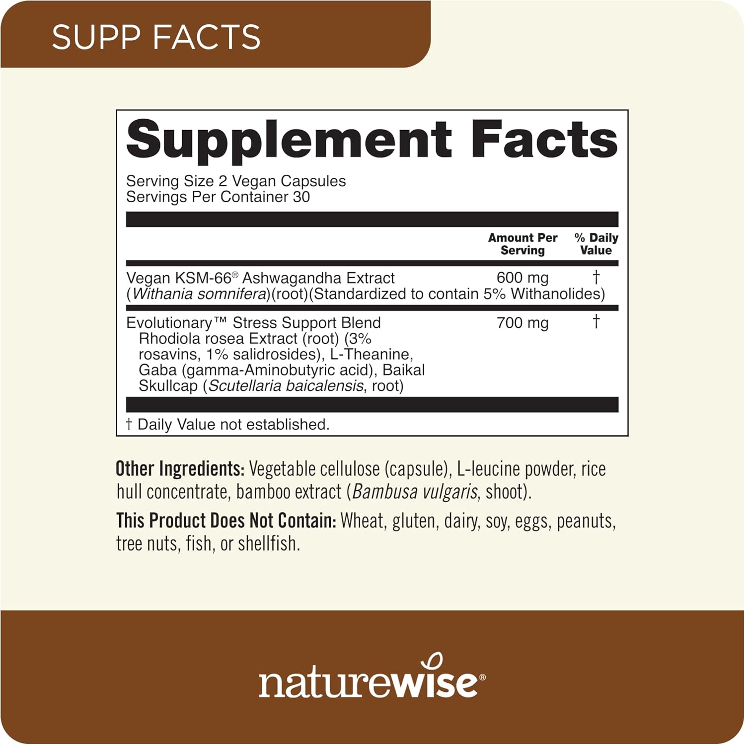 Naturewise Ashwagandha For Stress Is A Premium Blend Of Studied Herbs And Nutrients Designed To Promote A Healthy Stress Response And Better Sleep Quality.* Ashwagandha Is An Adaptogenic Herb That Has Been Shown In Studies To Support Overall Sleep Quality, Stress Response, And Mood. With 600 Mg Of Clinically Studied Ksm-66® Ashwagandha Extract In Each Serving, We’Ve Formulated A Stress Support Supplement To Help You After A Hard Day.* This Supplement Also Features The Evolutionary™ Stress Support Blend Which Contains Rhodiola, L-Theanine, Gaba, And Chinese Skullcap. Rhodiola Is A Botanical Ingredient That Also Contains Adaptogenic Qualities For Neurological Function. Rhodiola Has A Long History Of Being Used To Support The Body When It Is Experiencing Stress And For Energy Levels. L-Theanine Is An Amino Acid That Supports Sleep And Relaxation.* Gaba Is A Neurotransmitter Naturally Produced In The Brain, Which Manages Mood And Sleep. Taking Gaba Can Aid Your Sleep Quality And Mood, Which Supports A Healthy Stress Response.* This Stress Support Supplement Also Uses An Ancient Herb Used In Chinese Medicine Called Chinese Skullcap, Which Is Rich In Antioxidants.* Support Yourself In Times Of Stress With This Blend Of Quality Herbal Ingredients Curated For Complete Stress Support. Naturewise Ashwagandha For Stress Is Vegan, Gluten-Free, And Does Not Contain Wheat, Gluten, Eggs, Soy, Dairy, Tree Nuts, Peanuts, Fish, Or Shellfish. *Statements Regarding Dietary Supplements Have Not Been Evaluated By The Fda And Are Not Intended To Diagnose, Treat, Cure, Or Prevent Any Disease Or Health Condition