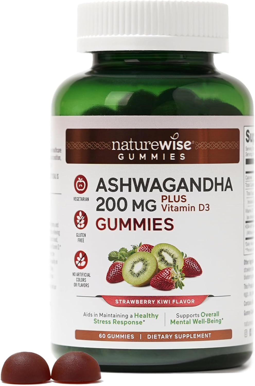 Naturewise Ashwagandha Gummies With Vitamin D3 Are A Delicious Way To Unwind After A Hard Day.* Say Goodbye To The Hassle Of Pills And Capsules And Hello To These Scrumptious Strawberry Kiwi Flavored Gummies. Ashwagandha Is An Adaptogenic Herb That Is Native To India And Has Been Used For Centuries. Naturewise Uses 200 Mg Of Clinically Studied Ksm-66® Ashwagandha Extract In Every Gummy To Support You Occasionally During Tough Times.* We Also Paired Ashwagandha With Vitamin D3, Also Known As The "Sunshine Vitamin," For Additional Health Support. Vitamin D3 Is The Most Bioavailable Form Of Vitamin D, Making It Absorption-Friendly. Having Enough Vitamin D3 In Your System Can Support Your Daily Health In Many Ways.* Plus, This Formula Comes In The Iconic Pairing Of Strawberry-Kiwi Flavor To Treat Your Tastebuds To A Sweet Gummy. Savor The Flavor Of Naturewise Ashwagandha Gummies – Because Self-Care Should Always Be A Delicious Treat. Naturewise'S Commitment To Quality Ensures That These Gummies Are Made With Premium Ingredients With No Artificial Colors Or Flavors. These Gummies Are Vegetarian And Pectin-Based, Maintaining A Nice Chewy Texture Without The Use Of Gelatin. Naturewise Ashwagandha Gummies Are Non-Gmo, Gluten-Free, And Third-Party Tested For Purity And Potency