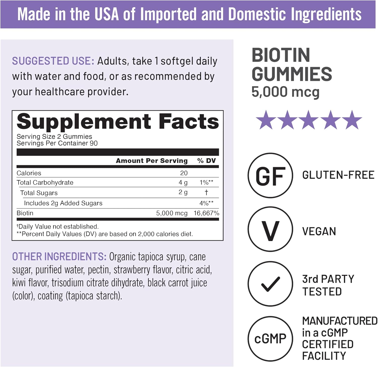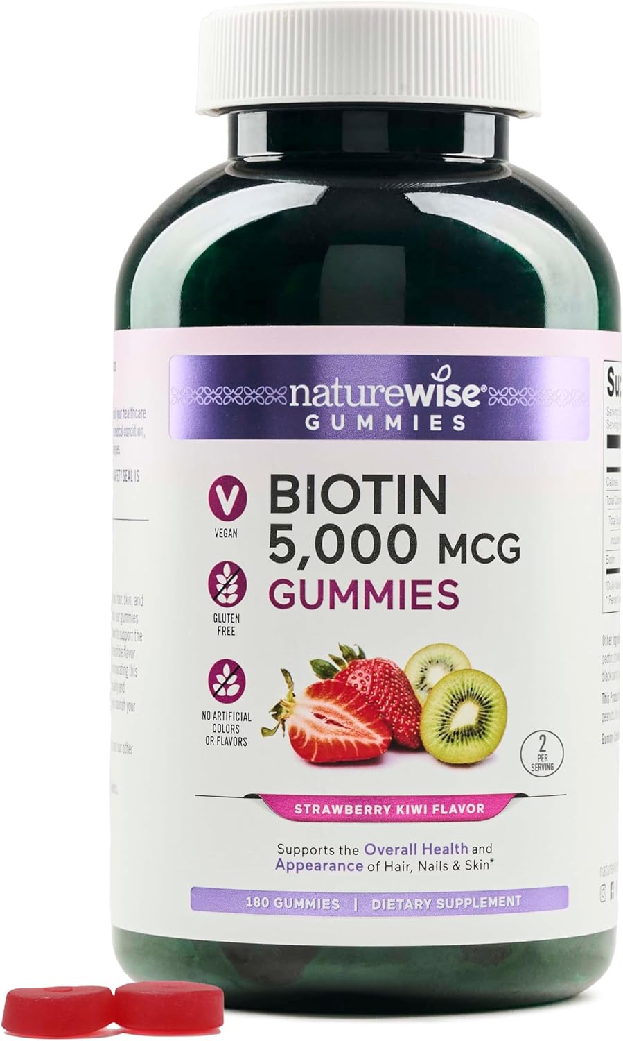 Naturewise Biotin Gummies - Supports Healthy Hair, Skin And Strong Nails - Vitamin B7 5000Mcg - Natural Beauty - Strawberry-Kiwi Flavor - Vegan, Non-Gmo, Gluten Free - 180 Count[90 Day Supply]