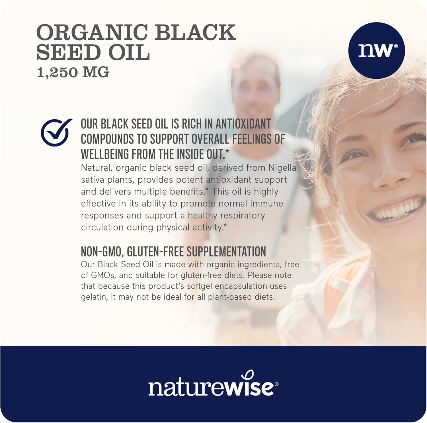 Naturewise Black Seed Oil Capsules 1250 Mg - With 100% Organic Cold Pressed Nigella Sativa - Omega 3 6 9 - Antioxidant Immune Support, Hair & Skin - Non-Gmo, Gluten-Free - 60 Softgels[1-Month Supply]