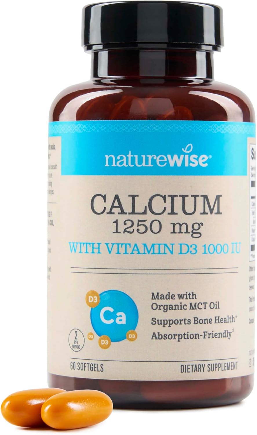 Naturewise Calcium 1250Mg With Vitamin D3 1000Iu - Bone Health And Immune System Supplement - Absorption Friendly, Made With Organic Mct Coconut Oil, Non-Gmo, Gluten Free - 60 Softgels[30-Day Supply]