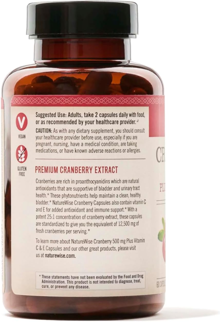 Naturewise Cranberry Extract Pills - 12,500Mg* Cranberries With Vitamin C & Vitamin E - Urinary Tract Health, Bladder Health, Immune Support - Vegan, Non-Gmo, Sugar-Free - 60 Capsules[1-Month Supply]